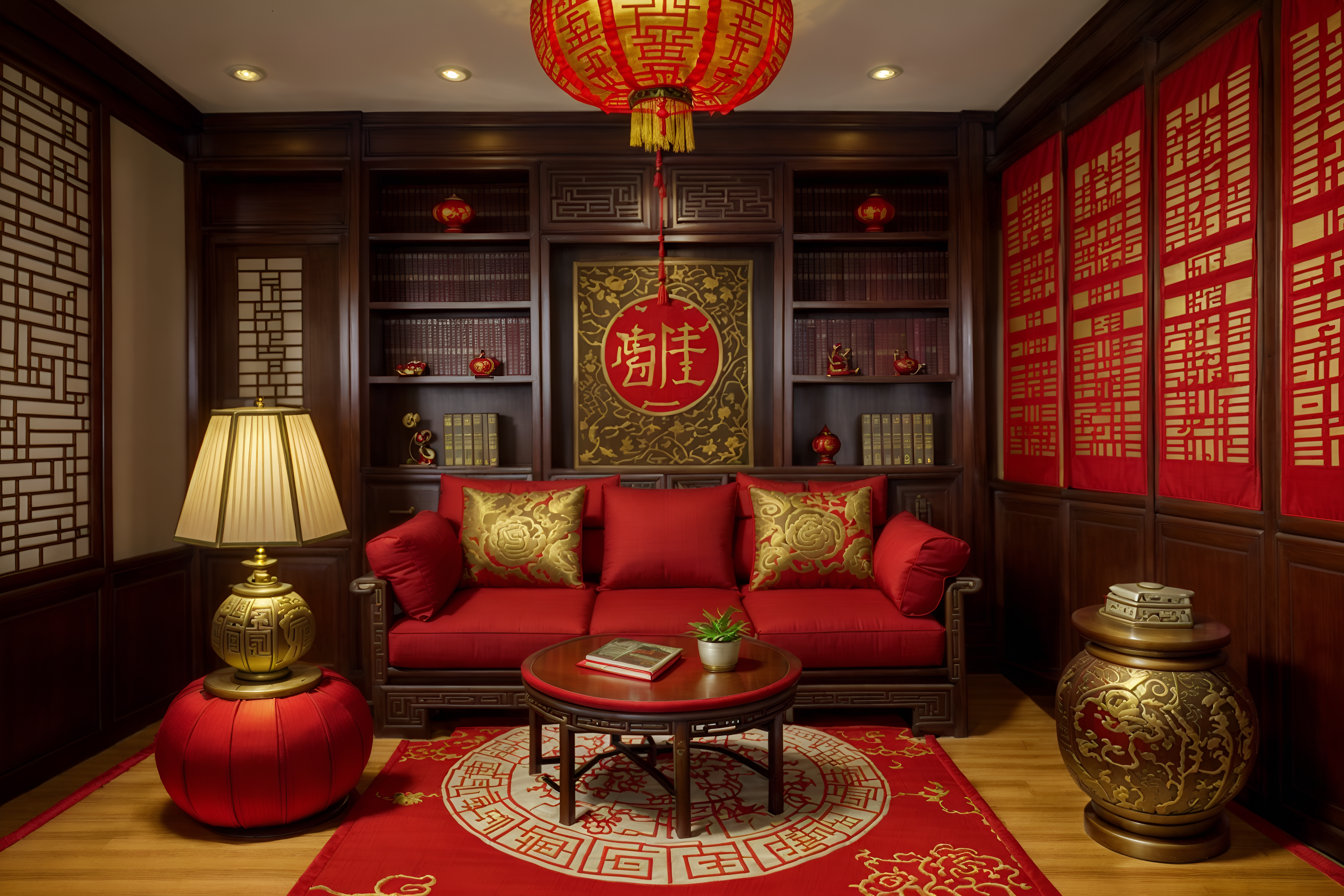 Chinese New Year study roomsinterior decorate this study room with chinese new year style. . . with writing desk and desk lamp and lounge chair and plant and bookshelves and office chair and cabinets and writing desk. . with paper cuttings and red and gold candles and chinese red lanterns and vases of plum blossoms and orchids and mei hwa flowers and chinese knots and zodiac calendar and paper firecrackers. . .