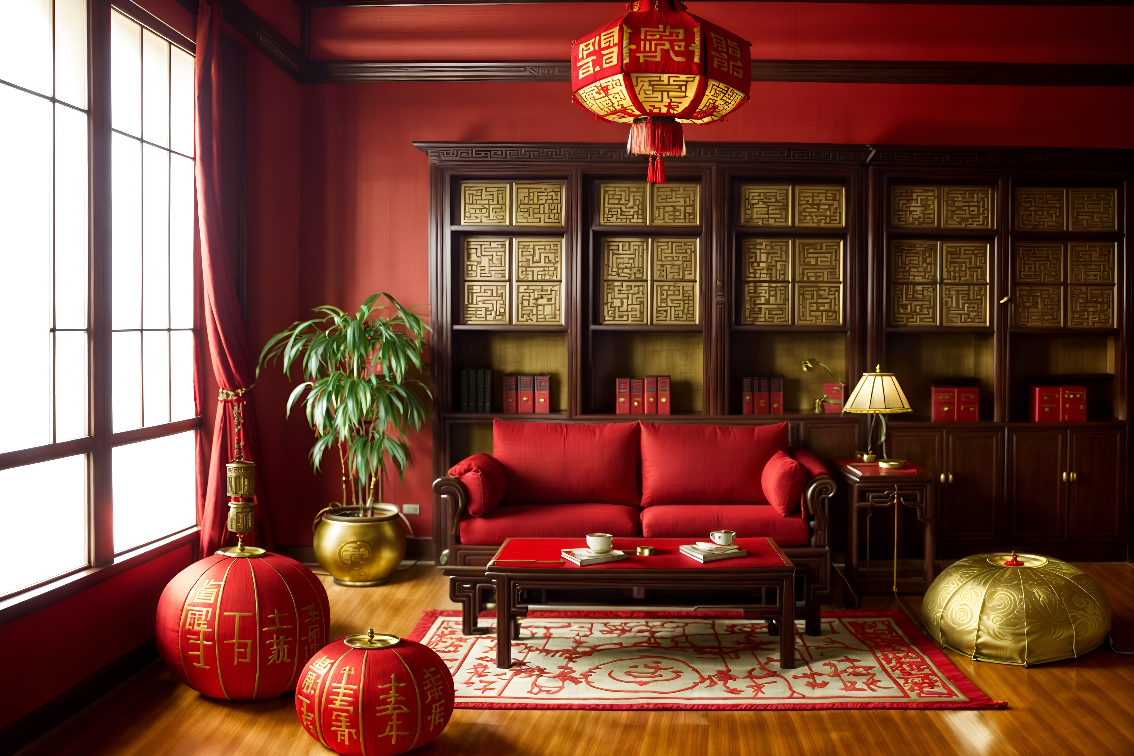 Chinese New Year interiorsinterior decorate this gallery with chinese new year style. . . with exhibition catalogs and paintings and white walls and sculptures and information plaques and artwork and pedestals and spotlights. . with red fabric & pillows and kumquat trees and gold ingots and chinese knots and door couplets and red and gold tassels and money tree and paper firecrackers. . .interior decorate this drop zone with chinese new year style. . . with a bench and cubbies and storage baskets and shelves for shoes and lockers and storage drawers and cabinets and high up storage. . with money tree and door couplets and gold ingots and chinese knots and red fabric & pillows and paper cuttings and red and gold candles and mei hwa flowers. . .interior decorate this outdoor garden with chinese new year style. . . with garden plants and garden tree and grass and garden plants. . with orange trees and chinese knots and money tree and door couplets and chinese red lanterns and kumquat trees and red fabric & pillows and gold ingots. . .interior decorate this podcast studio with chinese new year style. . . with headphones on table and acoustic soundproofing panels for damping sound and talk show studio and camera on tripod and comfortable podcast chair and radio show studio and talk show studio and sturdy desk. . with chinese red lanterns and red fabric & pillows and fai chun banners and red and gold tassels and orange trees and door couplets and gold ingots and red and gold candles. . .interior decorate this bathroom with chinese new year style. . . with bathroom cabinet and plant and bath rail and mirror and toilet seat and shower and bathtub and bathroom sink with faucet. . with vases of plum blossoms and orchids and chinese red lanterns and red and gold candles and fai chun banners and gold ingots and mei hwa flowers and zodiac calendar and money tree. . .interior decorate this laundry room with chinese new year style. . . with area rug and laundry tub and floating shelves and clothes hamper and clothes dryer and washing machine and cabinet and drying racks. . with zodiac calendar and orange trees and red and gold tassels and chinese knots and red and gold candles and money tree and gold ingots and mei hwa flowers. . .interior decorate this airport lounge with chinese new year style. . . with comfortable seating and wifi signs and refreshment bar and charging stations and newspapers and magazines and luggage storage and television screens. . with red and gold tassels and zodiac calendar and gold ingots and paper firecrackers and red and gold candles and orange trees and door couplets and kumquat trees. . .interior decorate this music stage with chinese new year style. . . with guitar stands and stage monitors and amplifiers and stage lights and backdrop and cables and sound mixing board and musical instruments. . with orange trees and fai chun banners and paper cuttings and kumquat trees and vases of plum blossoms and orchids and chinese red lanterns and mei hwa flowers and zodiac calendar. . .interior decorate this parking lot with chinese new year style. . . with payment kiosks and signage and white parking lot stripes and parking spaces and lighting poles and landscaping elements and drive lanes and parking lot. . with door couplets and kumquat trees and mei hwa flowers and fai chun banners and red and gold candles and red fabric & pillows and orange trees and paper firecrackers. . .
