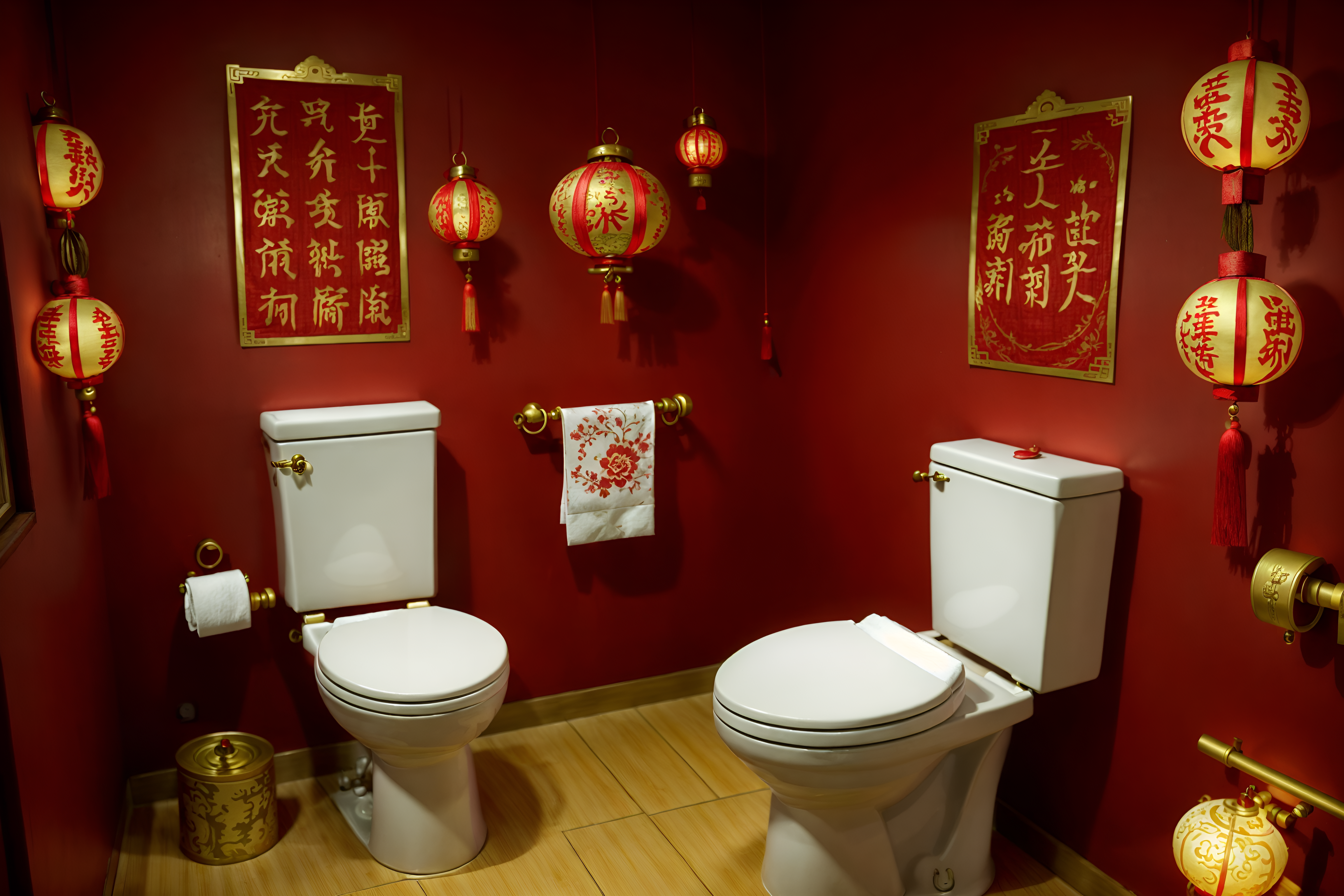 photo from pinterest of chinese new year-style interior designed (toilet interior) with sink with tap and toilet with toilet seat up and toilet paper hanger and sink with tap. . with zodiac calendar and chinese red lanterns and red and gold candles and money tree and paper firecrackers and red and gold tassels and gold ingots and red fabric & pillows. . cinematic photo, highly detailed, cinematic lighting, ultra-detailed, ultrarealistic, photorealism, 8k. trending on pinterest. chinese new year interior design style. masterpiece, cinematic light, ultrarealistic+, photorealistic+, 8k, raw photo, realistic, sharp focus on eyes, (symmetrical eyes), (intact eyes), hyperrealistic, highest quality, best quality, , highly detailed, masterpiece, best quality, extremely detailed 8k wallpaper, masterpiece, best quality, ultra-detailed, best shadow, detailed background, detailed face, detailed eyes, high contrast, best illumination, detailed face, dulux, caustic, dynamic angle, detailed glow. dramatic lighting. highly detailed, insanely detailed hair, symmetrical, intricate details, professionally retouched, 8k high definition. strong bokeh. award winning photo.