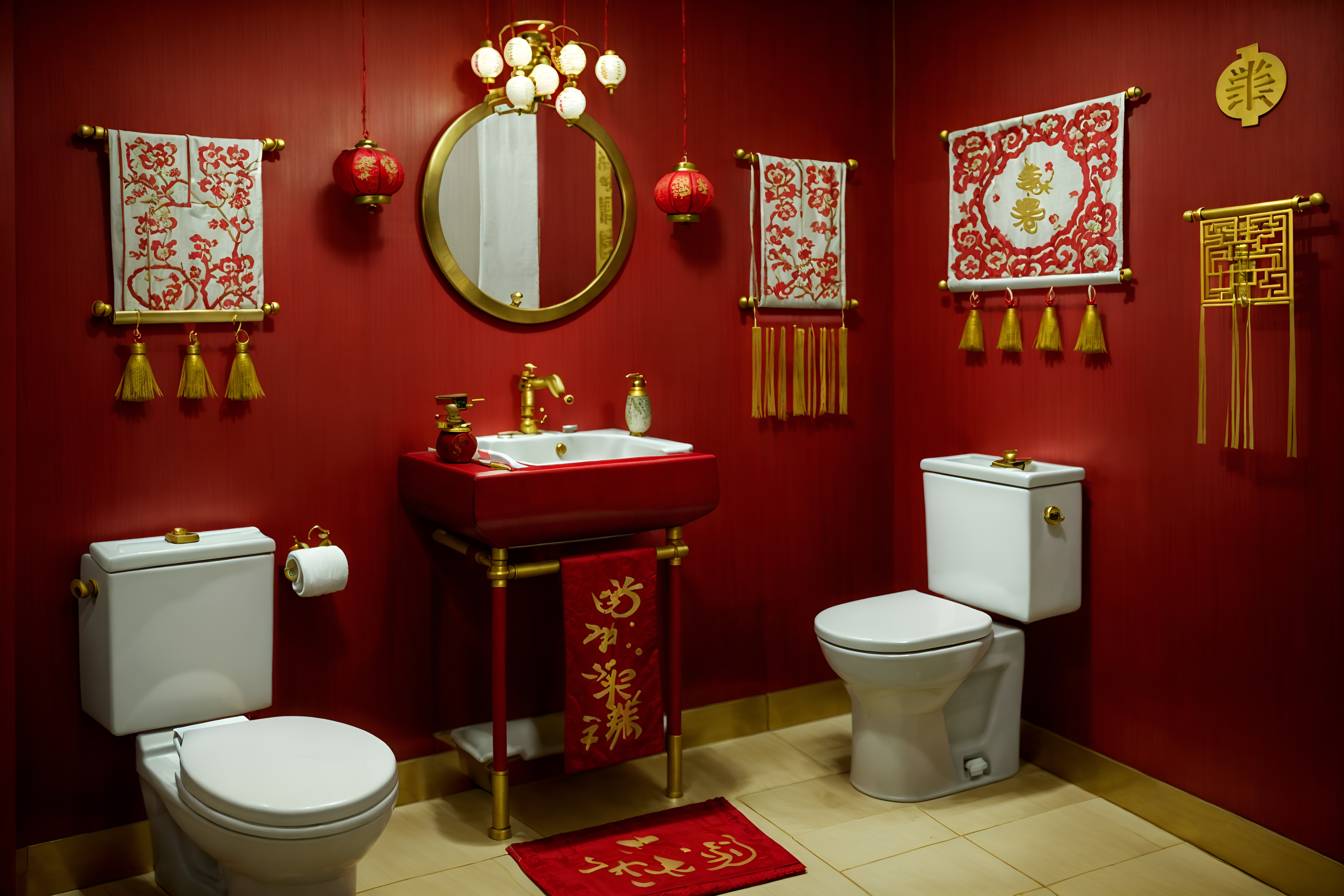 photo from pinterest of chinese new year-style interior designed (toilet interior) with sink with tap and toilet with toilet seat up and toilet paper hanger and sink with tap. . with zodiac calendar and chinese red lanterns and red and gold candles and money tree and paper firecrackers and red and gold tassels and gold ingots and red fabric & pillows. . cinematic photo, highly detailed, cinematic lighting, ultra-detailed, ultrarealistic, photorealism, 8k. trending on pinterest. chinese new year interior design style. masterpiece, cinematic light, ultrarealistic+, photorealistic+, 8k, raw photo, realistic, sharp focus on eyes, (symmetrical eyes), (intact eyes), hyperrealistic, highest quality, best quality, , highly detailed, masterpiece, best quality, extremely detailed 8k wallpaper, masterpiece, best quality, ultra-detailed, best shadow, detailed background, detailed face, detailed eyes, high contrast, best illumination, detailed face, dulux, caustic, dynamic angle, detailed glow. dramatic lighting. highly detailed, insanely detailed hair, symmetrical, intricate details, professionally retouched, 8k high definition. strong bokeh. award winning photo.