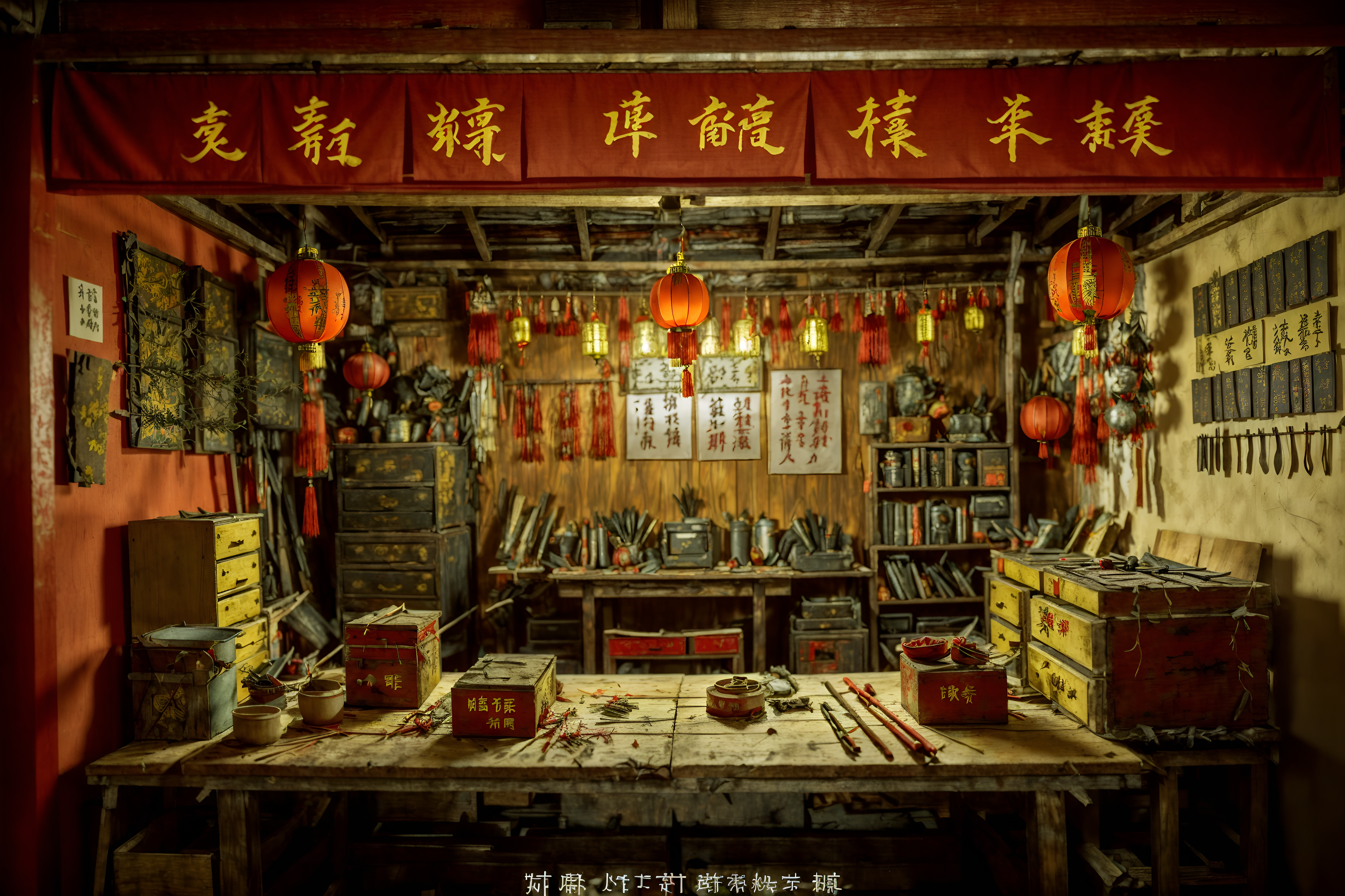 photo from pinterest of chinese new year-style interior designed (workshop interior) with messy and wooden workbench and tool wall and messy. . with paper firecrackers and zodiac calendar and orange trees and door couplets and red and gold tassels and red and gold candles and mei hwa flowers and kumquat trees. . cinematic photo, highly detailed, cinematic lighting, ultra-detailed, ultrarealistic, photorealism, 8k. trending on pinterest. chinese new year interior design style. masterpiece, cinematic light, ultrarealistic+, photorealistic+, 8k, raw photo, realistic, sharp focus on eyes, (symmetrical eyes), (intact eyes), hyperrealistic, highest quality, best quality, , highly detailed, masterpiece, best quality, extremely detailed 8k wallpaper, masterpiece, best quality, ultra-detailed, best shadow, detailed background, detailed face, detailed eyes, high contrast, best illumination, detailed face, dulux, caustic, dynamic angle, detailed glow. dramatic lighting. highly detailed, insanely detailed hair, symmetrical, intricate details, professionally retouched, 8k high definition. strong bokeh. award winning photo.