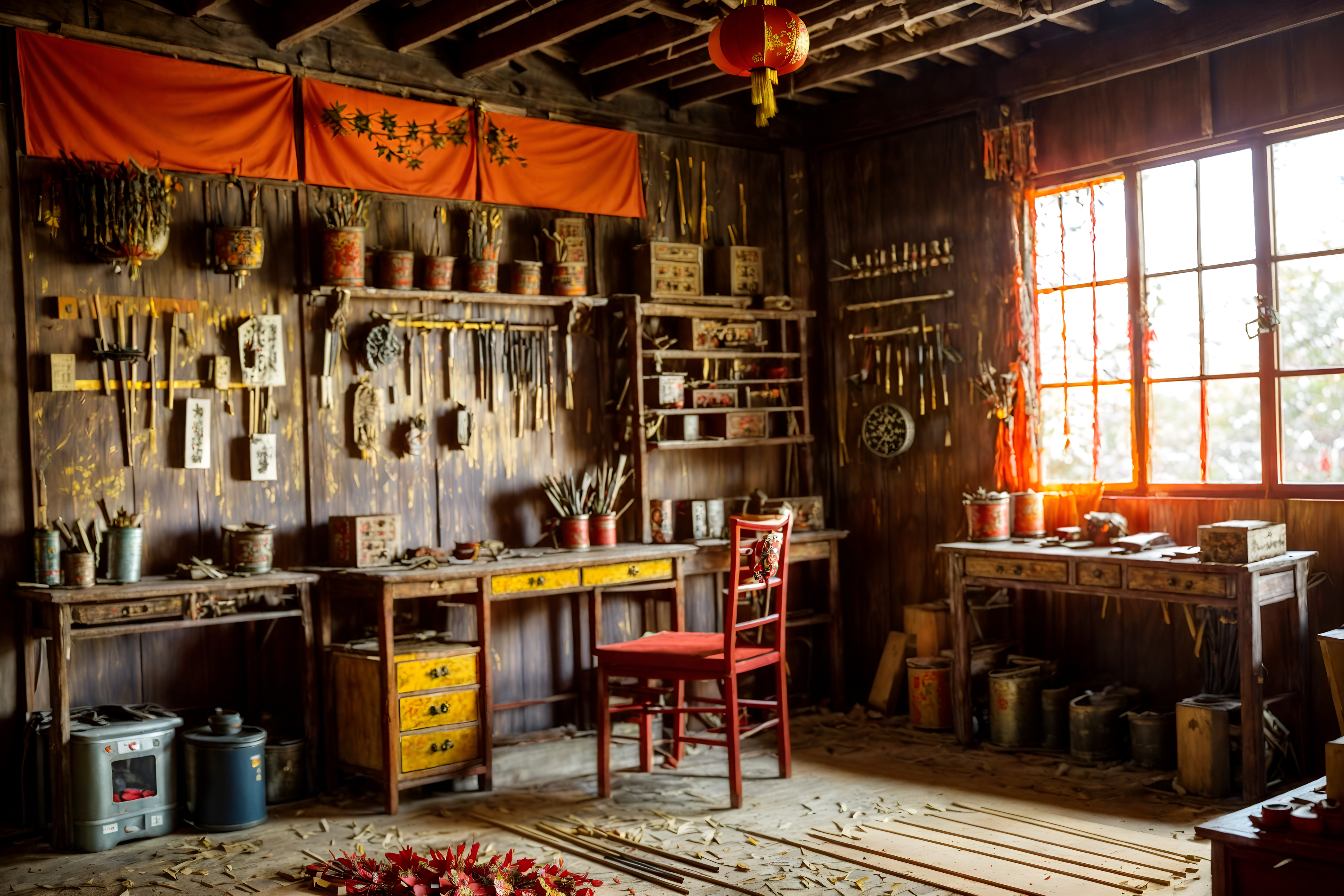 photo from pinterest of chinese new year-style interior designed (workshop interior) with messy and wooden workbench and tool wall and messy. . with paper firecrackers and zodiac calendar and orange trees and door couplets and red and gold tassels and red and gold candles and mei hwa flowers and kumquat trees. . cinematic photo, highly detailed, cinematic lighting, ultra-detailed, ultrarealistic, photorealism, 8k. trending on pinterest. chinese new year interior design style. masterpiece, cinematic light, ultrarealistic+, photorealistic+, 8k, raw photo, realistic, sharp focus on eyes, (symmetrical eyes), (intact eyes), hyperrealistic, highest quality, best quality, , highly detailed, masterpiece, best quality, extremely detailed 8k wallpaper, masterpiece, best quality, ultra-detailed, best shadow, detailed background, detailed face, detailed eyes, high contrast, best illumination, detailed face, dulux, caustic, dynamic angle, detailed glow. dramatic lighting. highly detailed, insanely detailed hair, symmetrical, intricate details, professionally retouched, 8k high definition. strong bokeh. award winning photo.