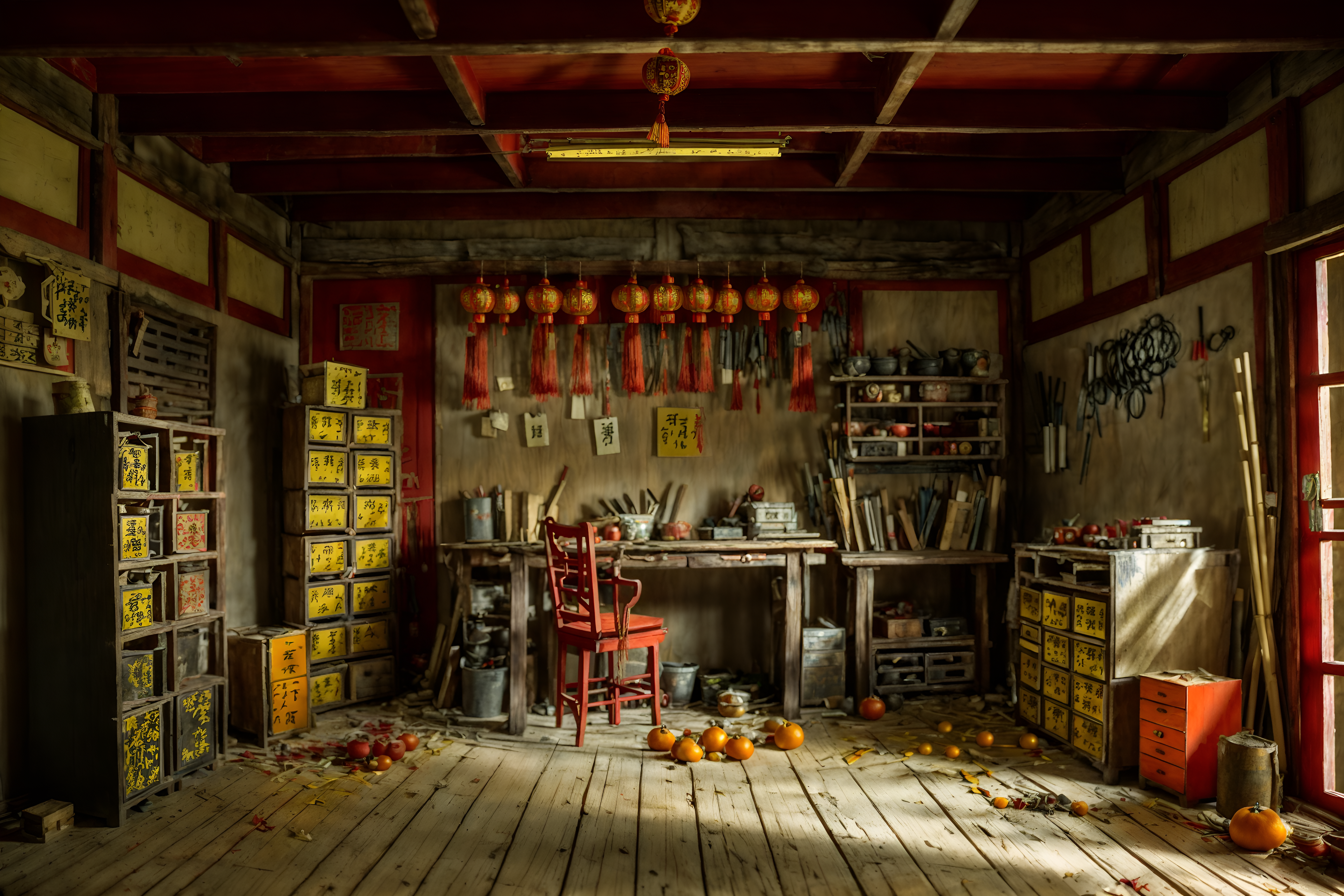 photo from pinterest of chinese new year-style interior designed (workshop interior) with messy and wooden workbench and tool wall and messy. . with paper firecrackers and zodiac calendar and orange trees and door couplets and red and gold tassels and red and gold candles and mei hwa flowers and kumquat trees. . cinematic photo, highly detailed, cinematic lighting, ultra-detailed, ultrarealistic, photorealism, 8k. trending on pinterest. chinese new year interior design style. masterpiece, cinematic light, ultrarealistic+, photorealistic+, 8k, raw photo, realistic, sharp focus on eyes, (symmetrical eyes), (intact eyes), hyperrealistic, highest quality, best quality, , highly detailed, masterpiece, best quality, extremely detailed 8k wallpaper, masterpiece, best quality, ultra-detailed, best shadow, detailed background, detailed face, detailed eyes, high contrast, best illumination, detailed face, dulux, caustic, dynamic angle, detailed glow. dramatic lighting. highly detailed, insanely detailed hair, symmetrical, intricate details, professionally retouched, 8k high definition. strong bokeh. award winning photo.