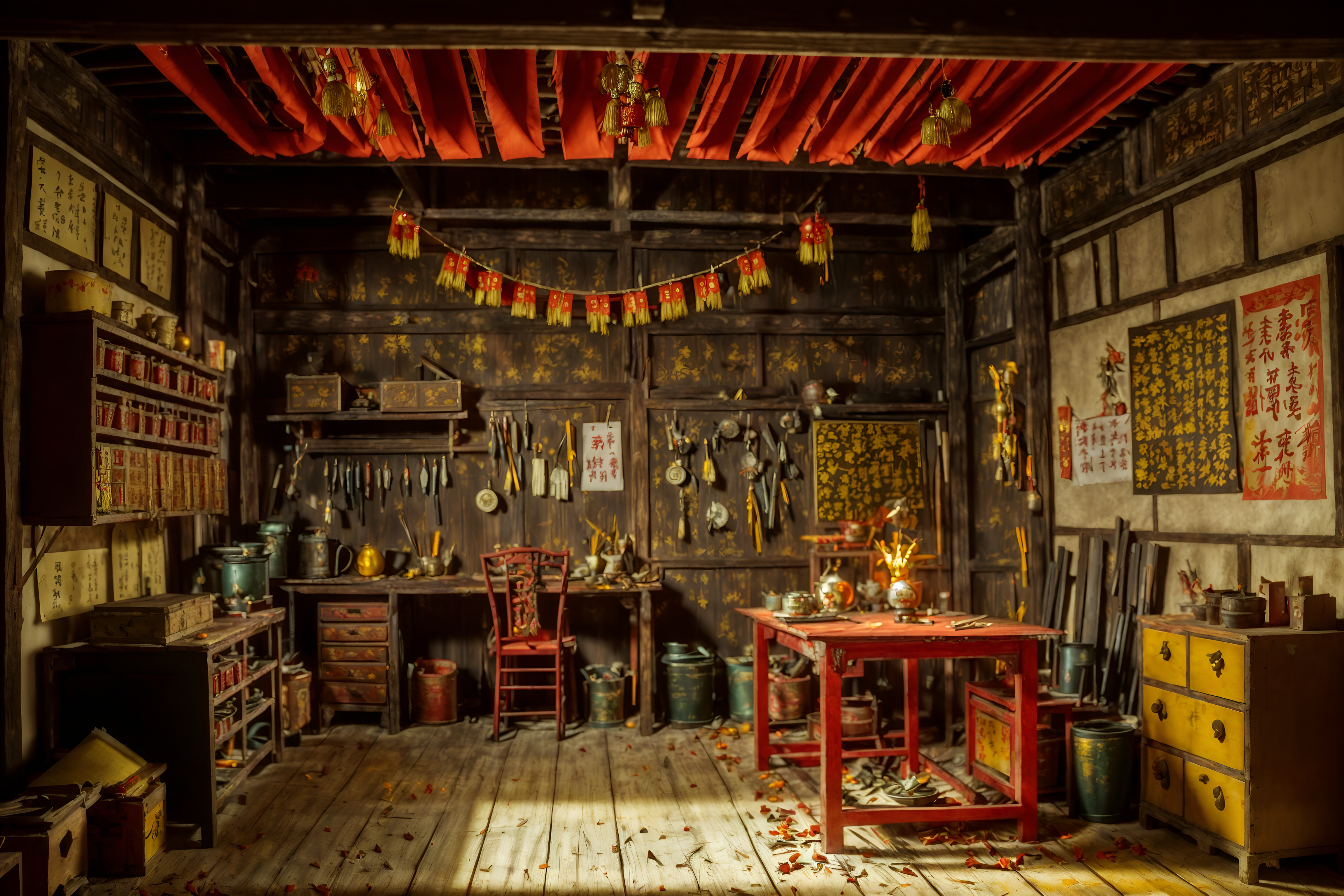 photo from pinterest of chinese new year-style interior designed (workshop interior) with messy and wooden workbench and tool wall and messy. . with paper firecrackers and zodiac calendar and orange trees and door couplets and red and gold tassels and red and gold candles and mei hwa flowers and kumquat trees. . cinematic photo, highly detailed, cinematic lighting, ultra-detailed, ultrarealistic, photorealism, 8k. trending on pinterest. chinese new year interior design style. masterpiece, cinematic light, ultrarealistic+, photorealistic+, 8k, raw photo, realistic, sharp focus on eyes, (symmetrical eyes), (intact eyes), hyperrealistic, highest quality, best quality, , highly detailed, masterpiece, best quality, extremely detailed 8k wallpaper, masterpiece, best quality, ultra-detailed, best shadow, detailed background, detailed face, detailed eyes, high contrast, best illumination, detailed face, dulux, caustic, dynamic angle, detailed glow. dramatic lighting. highly detailed, insanely detailed hair, symmetrical, intricate details, professionally retouched, 8k high definition. strong bokeh. award winning photo.