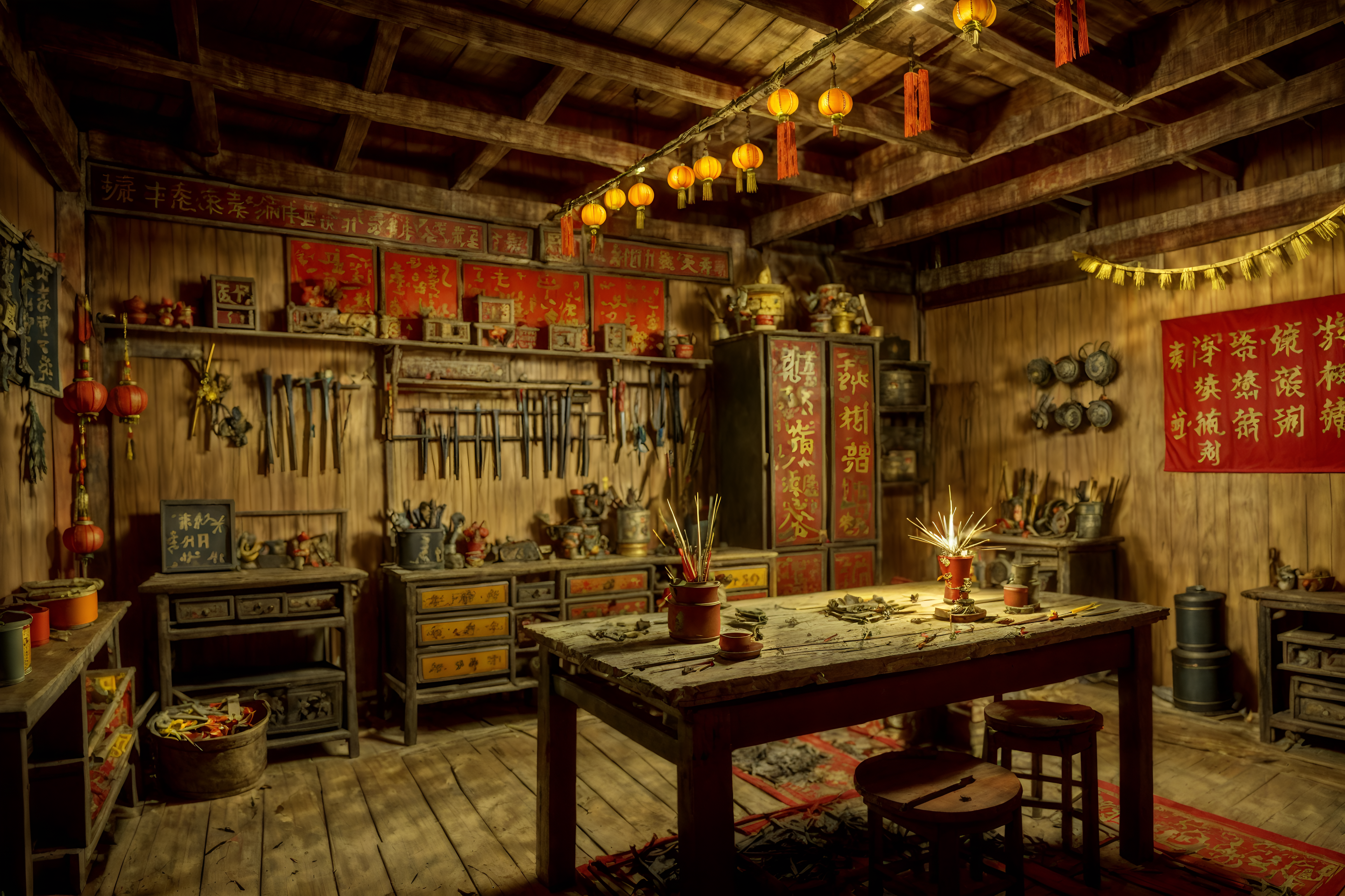 photo from pinterest of chinese new year-style interior designed (workshop interior) with messy and wooden workbench and tool wall and messy. . with paper firecrackers and zodiac calendar and orange trees and door couplets and red and gold tassels and red and gold candles and mei hwa flowers and kumquat trees. . cinematic photo, highly detailed, cinematic lighting, ultra-detailed, ultrarealistic, photorealism, 8k. trending on pinterest. chinese new year interior design style. masterpiece, cinematic light, ultrarealistic+, photorealistic+, 8k, raw photo, realistic, sharp focus on eyes, (symmetrical eyes), (intact eyes), hyperrealistic, highest quality, best quality, , highly detailed, masterpiece, best quality, extremely detailed 8k wallpaper, masterpiece, best quality, ultra-detailed, best shadow, detailed background, detailed face, detailed eyes, high contrast, best illumination, detailed face, dulux, caustic, dynamic angle, detailed glow. dramatic lighting. highly detailed, insanely detailed hair, symmetrical, intricate details, professionally retouched, 8k high definition. strong bokeh. award winning photo.
