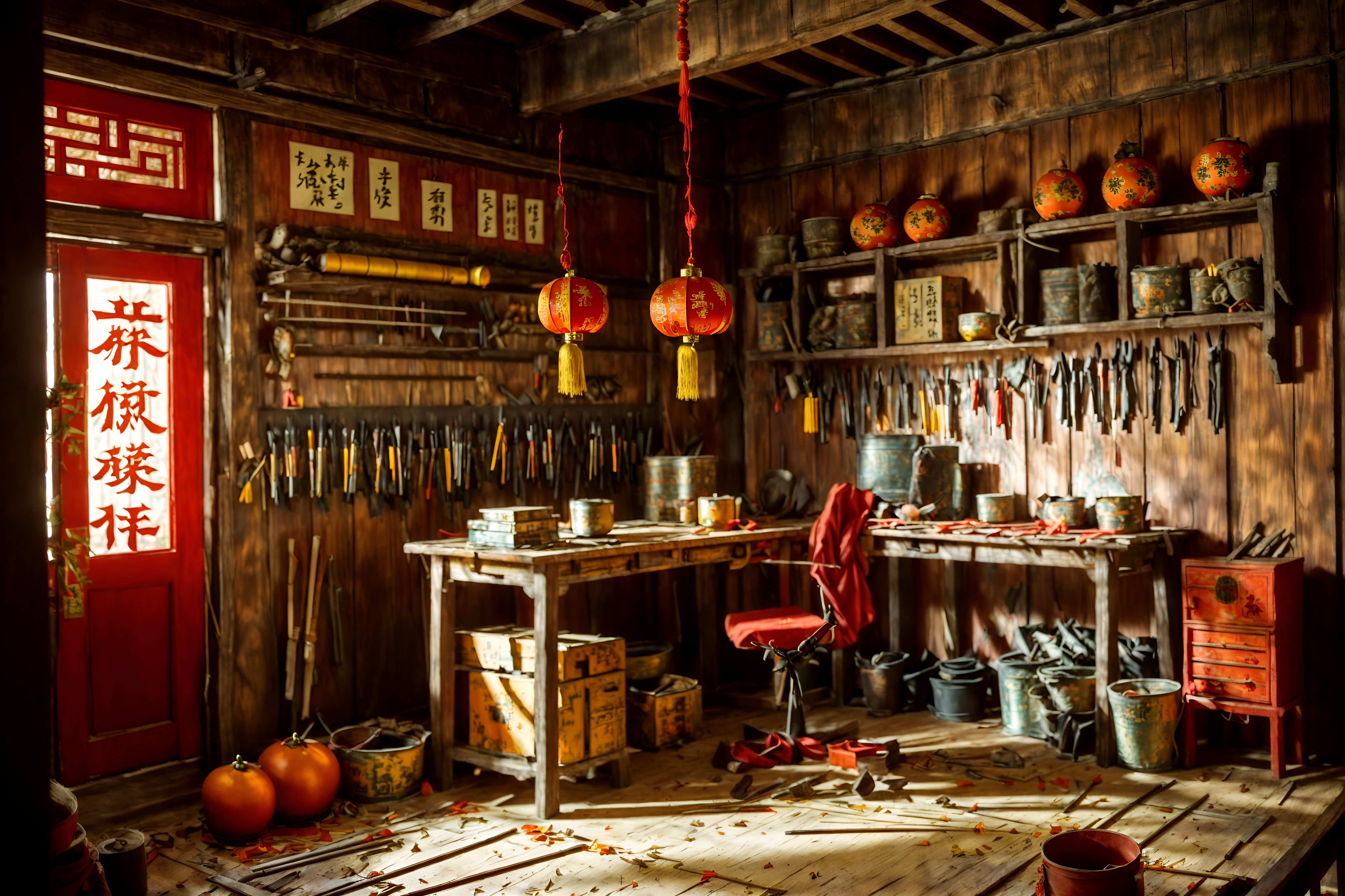 photo from pinterest of chinese new year-style interior designed (workshop interior) with messy and wooden workbench and tool wall and messy. . with paper firecrackers and zodiac calendar and orange trees and door couplets and red and gold tassels and red and gold candles and mei hwa flowers and kumquat trees. . cinematic photo, highly detailed, cinematic lighting, ultra-detailed, ultrarealistic, photorealism, 8k. trending on pinterest. chinese new year interior design style. masterpiece, cinematic light, ultrarealistic+, photorealistic+, 8k, raw photo, realistic, sharp focus on eyes, (symmetrical eyes), (intact eyes), hyperrealistic, highest quality, best quality, , highly detailed, masterpiece, best quality, extremely detailed 8k wallpaper, masterpiece, best quality, ultra-detailed, best shadow, detailed background, detailed face, detailed eyes, high contrast, best illumination, detailed face, dulux, caustic, dynamic angle, detailed glow. dramatic lighting. highly detailed, insanely detailed hair, symmetrical, intricate details, professionally retouched, 8k high definition. strong bokeh. award winning photo.