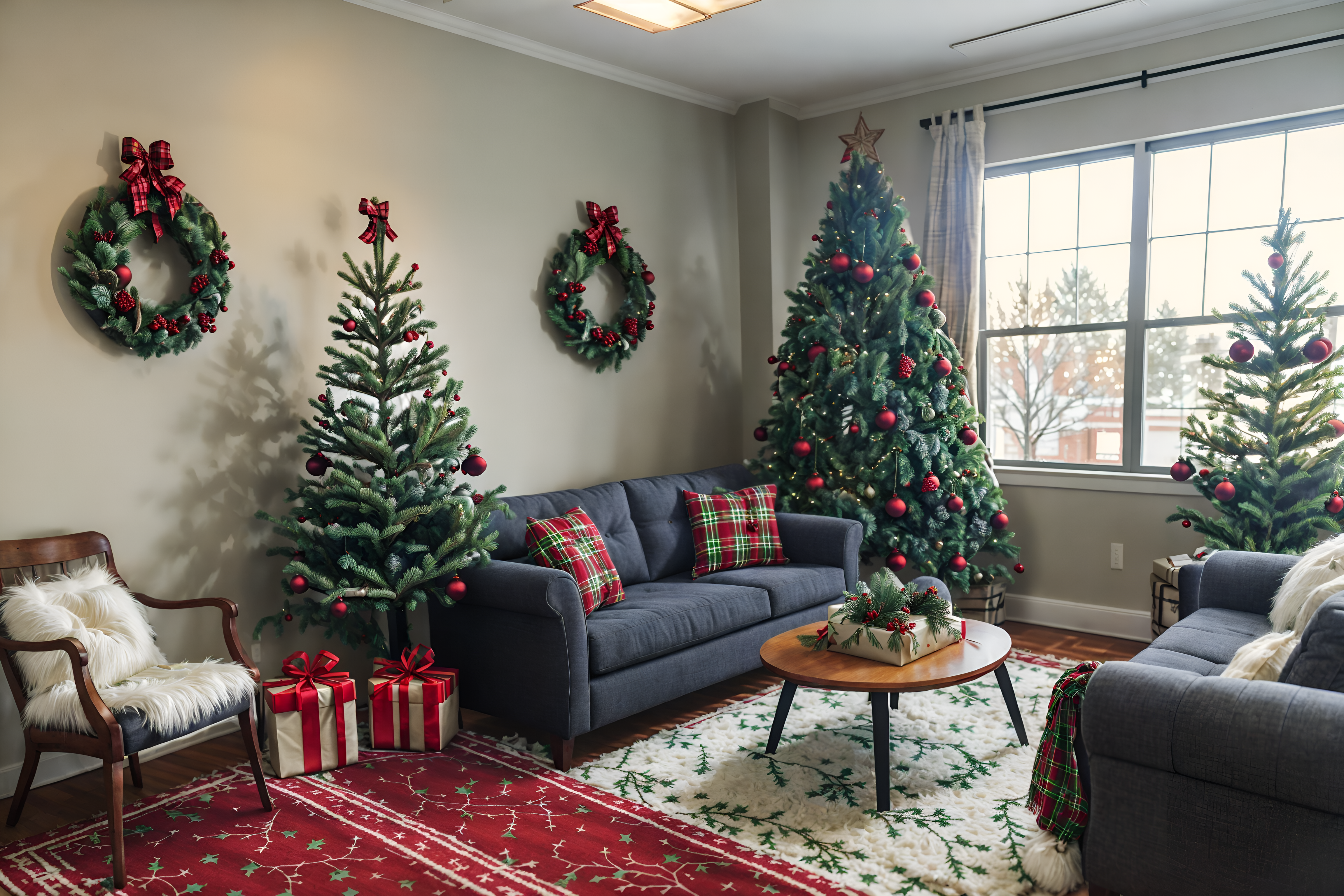 photo from pinterest of christmas-style interior designed (coworking space interior) with office desks and lounge chairs and seating area with sofa and office chairs and office desks. . with christmas ornaments and berries and greenery draped and snow outside and ribbons and giftwrapped gifts and a few big socks hanging and tie pinecones and berries and plaid rugs. . cinematic photo, highly detailed, cinematic lighting, ultra-detailed, ultrarealistic, photorealism, 8k. trending on pinterest. christmas interior design style. masterpiece, cinematic light, ultrarealistic+, photorealistic+, 8k, raw photo, realistic, sharp focus on eyes, (symmetrical eyes), (intact eyes), hyperrealistic, highest quality, best quality, , highly detailed, masterpiece, best quality, extremely detailed 8k wallpaper, masterpiece, best quality, ultra-detailed, best shadow, detailed background, detailed face, detailed eyes, high contrast, best illumination, detailed face, dulux, caustic, dynamic angle, detailed glow. dramatic lighting. highly detailed, insanely detailed hair, symmetrical, intricate details, professionally retouched, 8k high definition. strong bokeh. award winning photo.