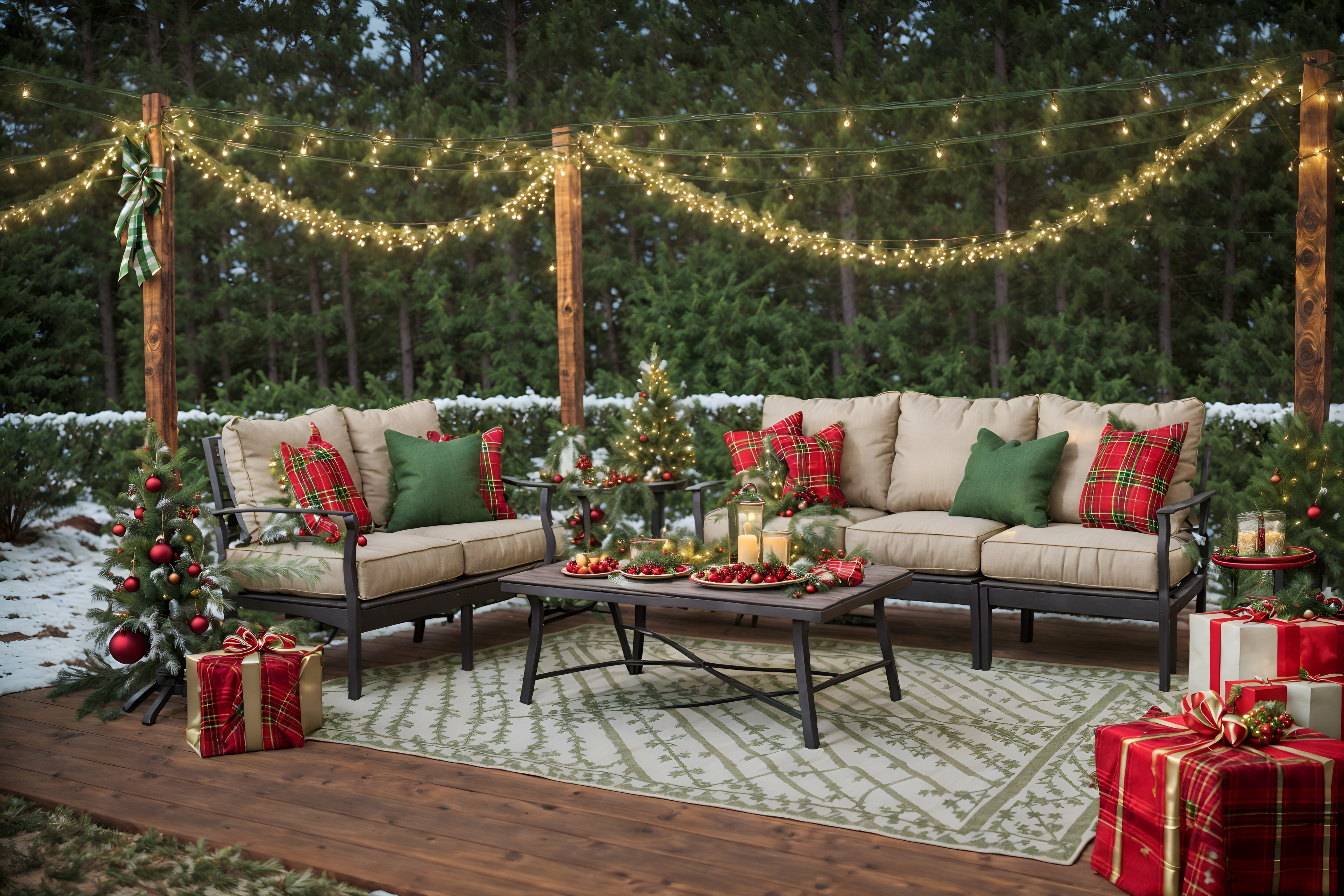 photo from pinterest of christmas-style designed (outdoor patio ) with barbeque or grill and grass and plant and patio couch with pillows and deck with deck chairs and barbeque or grill. . with a few big socks hanging and plaid rugs and christmas ornaments and snow outside and giftwrapped gifts and ribbons and berries and greenery draped and tie pinecones and berries. . cinematic photo, highly detailed, cinematic lighting, ultra-detailed, ultrarealistic, photorealism, 8k. trending on pinterest. christmas design style. masterpiece, cinematic light, ultrarealistic+, photorealistic+, 8k, raw photo, realistic, sharp focus on eyes, (symmetrical eyes), (intact eyes), hyperrealistic, highest quality, best quality, , highly detailed, masterpiece, best quality, extremely detailed 8k wallpaper, masterpiece, best quality, ultra-detailed, best shadow, detailed background, detailed face, detailed eyes, high contrast, best illumination, detailed face, dulux, caustic, dynamic angle, detailed glow. dramatic lighting. highly detailed, insanely detailed hair, symmetrical, intricate details, professionally retouched, 8k high definition. strong bokeh. award winning photo.