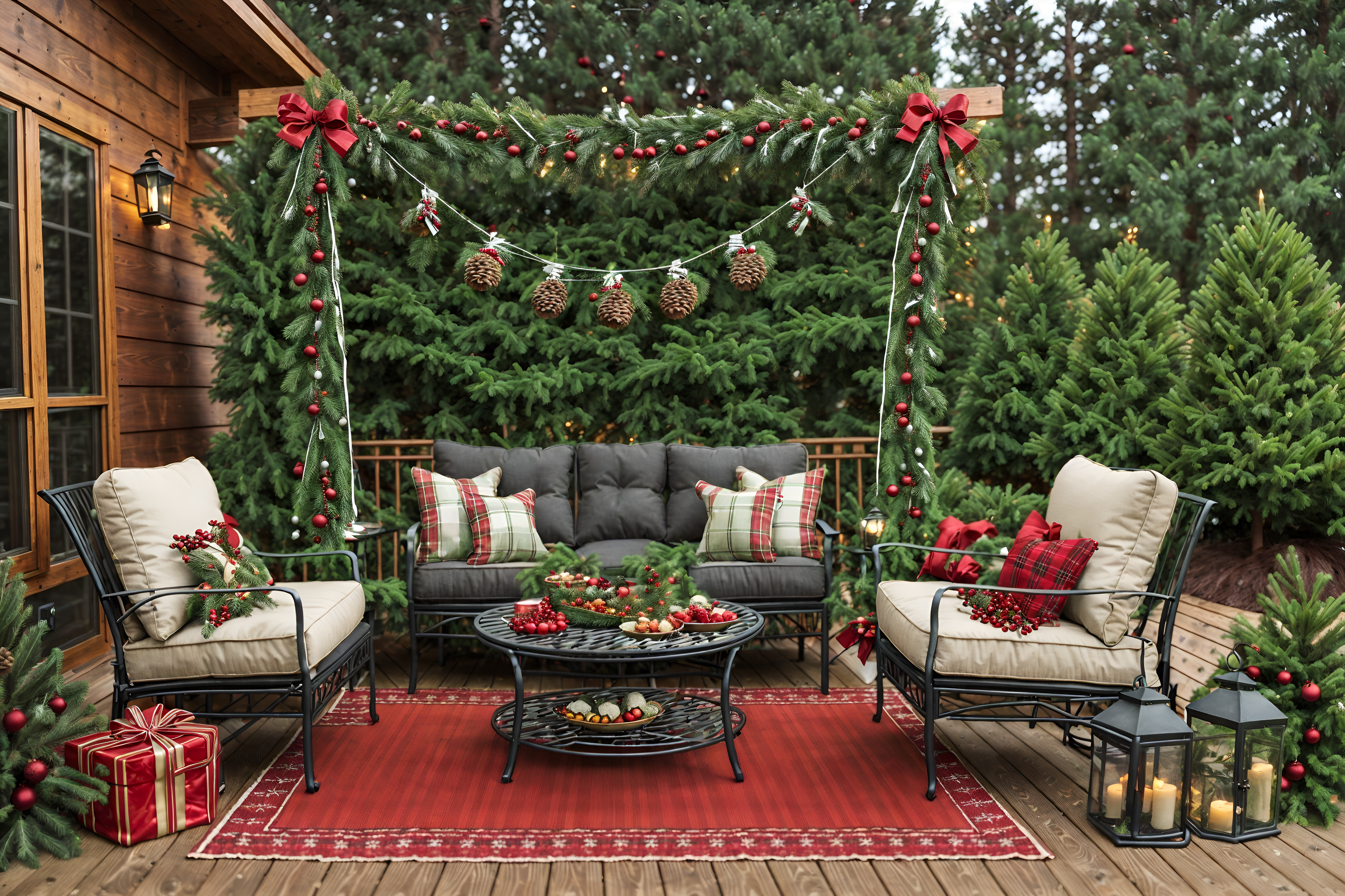 photo from pinterest of christmas-style designed (outdoor patio ) with barbeque or grill and grass and plant and patio couch with pillows and deck with deck chairs and barbeque or grill. . with a few big socks hanging and plaid rugs and christmas ornaments and snow outside and giftwrapped gifts and ribbons and berries and greenery draped and tie pinecones and berries. . cinematic photo, highly detailed, cinematic lighting, ultra-detailed, ultrarealistic, photorealism, 8k. trending on pinterest. christmas design style. masterpiece, cinematic light, ultrarealistic+, photorealistic+, 8k, raw photo, realistic, sharp focus on eyes, (symmetrical eyes), (intact eyes), hyperrealistic, highest quality, best quality, , highly detailed, masterpiece, best quality, extremely detailed 8k wallpaper, masterpiece, best quality, ultra-detailed, best shadow, detailed background, detailed face, detailed eyes, high contrast, best illumination, detailed face, dulux, caustic, dynamic angle, detailed glow. dramatic lighting. highly detailed, insanely detailed hair, symmetrical, intricate details, professionally retouched, 8k high definition. strong bokeh. award winning photo.