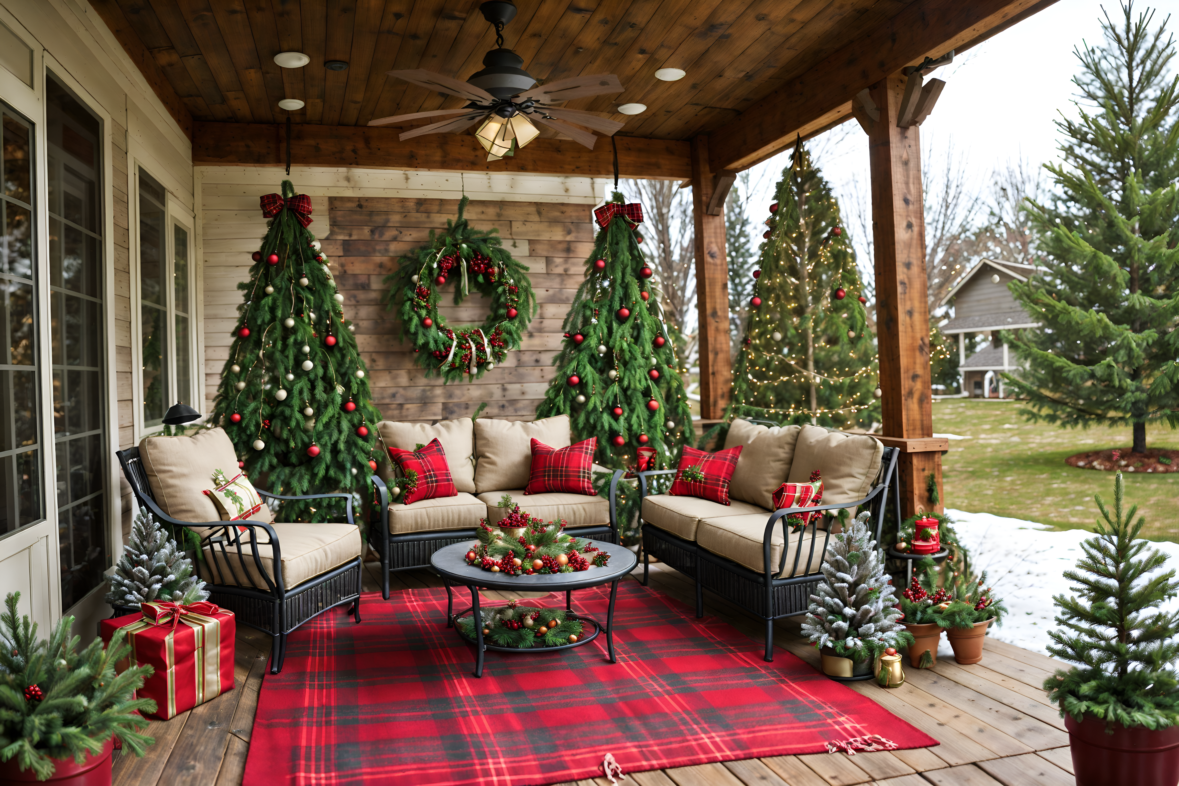 photo from pinterest of christmas-style designed (outdoor patio ) with barbeque or grill and grass and plant and patio couch with pillows and deck with deck chairs and barbeque or grill. . with a few big socks hanging and plaid rugs and christmas ornaments and snow outside and giftwrapped gifts and ribbons and berries and greenery draped and tie pinecones and berries. . cinematic photo, highly detailed, cinematic lighting, ultra-detailed, ultrarealistic, photorealism, 8k. trending on pinterest. christmas design style. masterpiece, cinematic light, ultrarealistic+, photorealistic+, 8k, raw photo, realistic, sharp focus on eyes, (symmetrical eyes), (intact eyes), hyperrealistic, highest quality, best quality, , highly detailed, masterpiece, best quality, extremely detailed 8k wallpaper, masterpiece, best quality, ultra-detailed, best shadow, detailed background, detailed face, detailed eyes, high contrast, best illumination, detailed face, dulux, caustic, dynamic angle, detailed glow. dramatic lighting. highly detailed, insanely detailed hair, symmetrical, intricate details, professionally retouched, 8k high definition. strong bokeh. award winning photo.