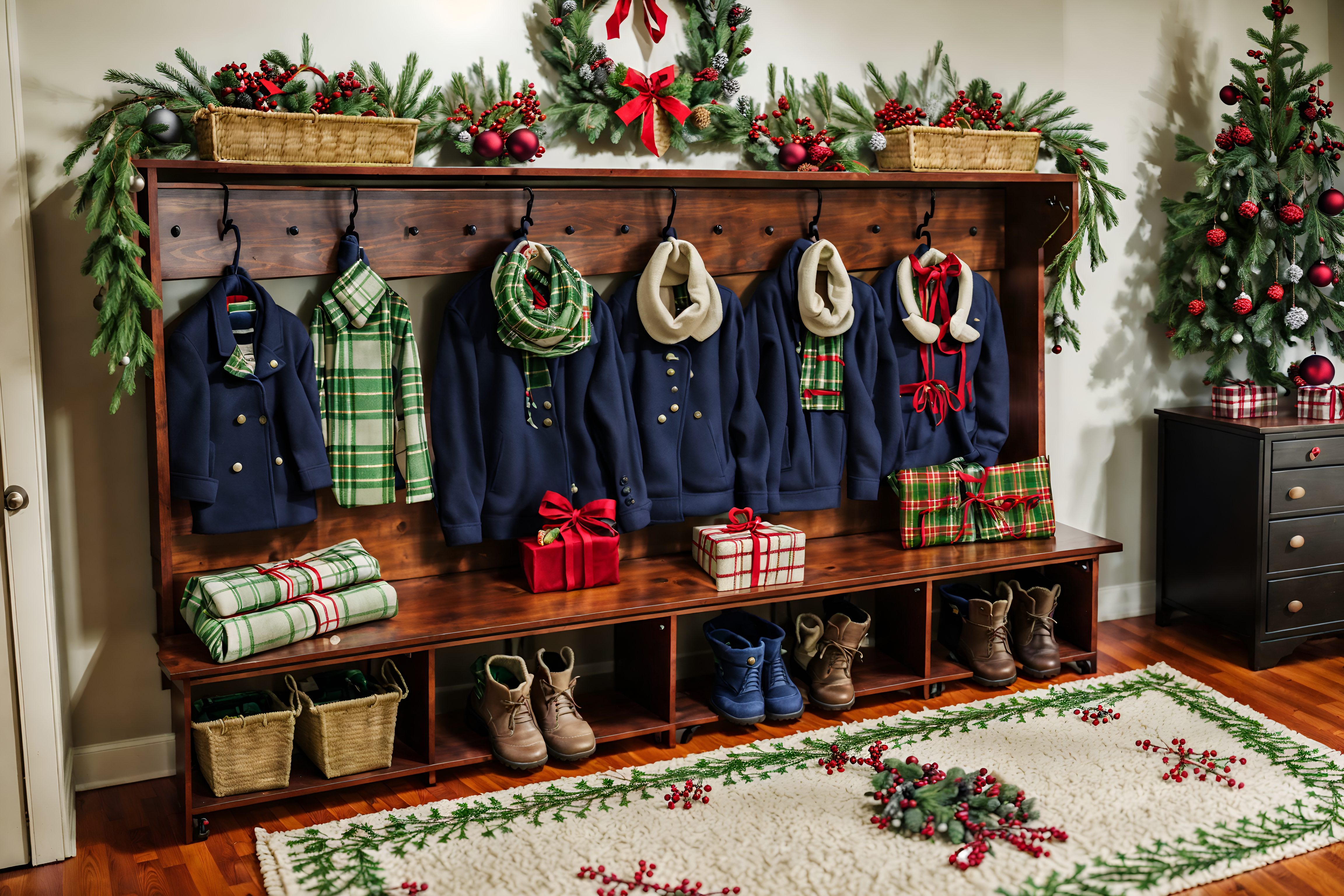 photo from pinterest of christmas-style interior designed (drop zone interior) with shelves for shoes and lockers and cabinets and a bench and storage baskets and storage drawers and cubbies and wall hooks for coats. . with snow outside and berries and greenery draped and a few big socks hanging and giftwrapped gifts and ribbons and tie pinecones and berries and christmas ornaments and plaid rugs. . cinematic photo, highly detailed, cinematic lighting, ultra-detailed, ultrarealistic, photorealism, 8k. trending on pinterest. christmas interior design style. masterpiece, cinematic light, ultrarealistic+, photorealistic+, 8k, raw photo, realistic, sharp focus on eyes, (symmetrical eyes), (intact eyes), hyperrealistic, highest quality, best quality, , highly detailed, masterpiece, best quality, extremely detailed 8k wallpaper, masterpiece, best quality, ultra-detailed, best shadow, detailed background, detailed face, detailed eyes, high contrast, best illumination, detailed face, dulux, caustic, dynamic angle, detailed glow. dramatic lighting. highly detailed, insanely detailed hair, symmetrical, intricate details, professionally retouched, 8k high definition. strong bokeh. award winning photo.