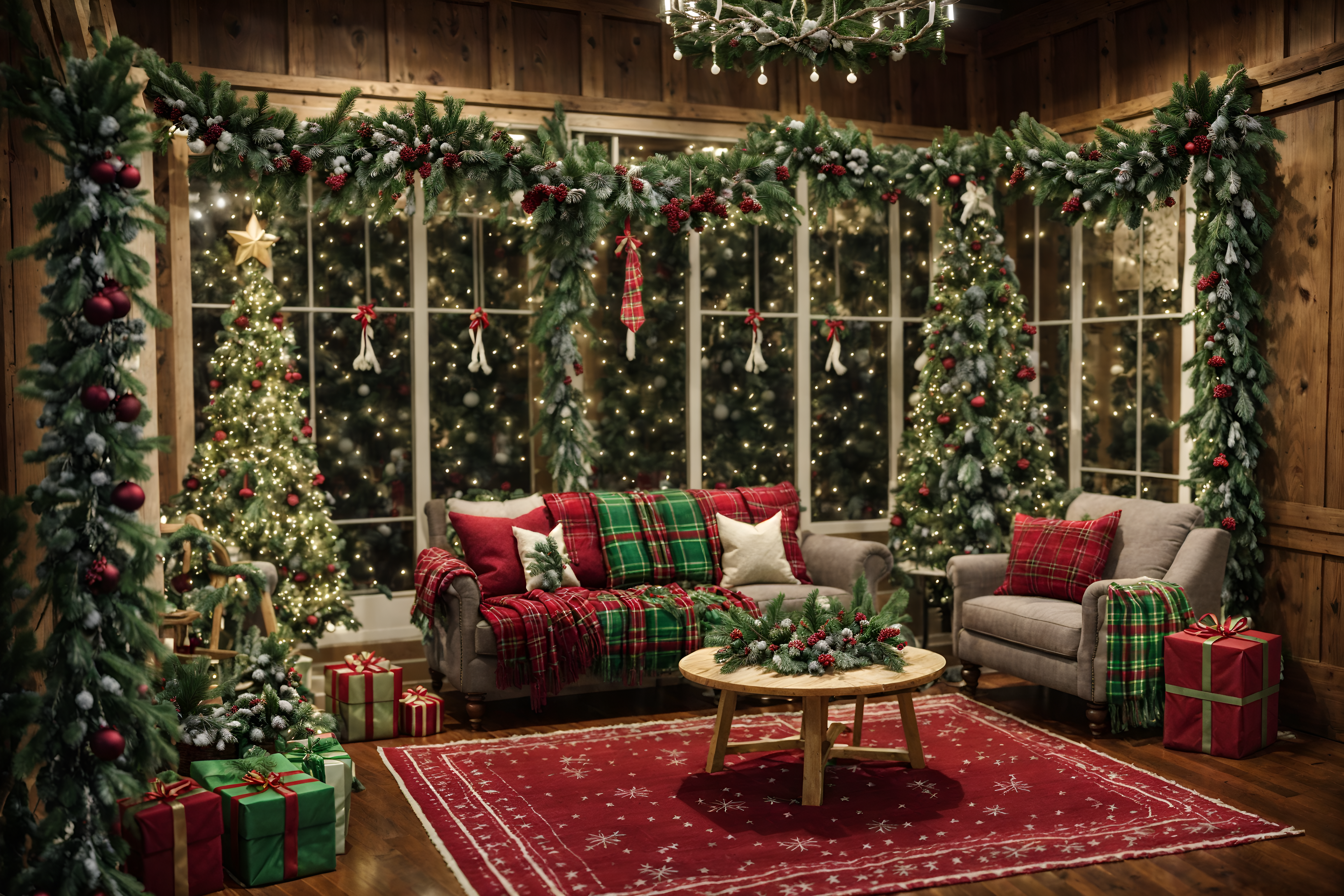 photo from pinterest of christmas-style interior designed (exhibition space interior) . with berries and greenery draped and a few big socks hanging and snow outside and ribbons and plaid rugs and tie pinecones and berries and christmas ornaments and giftwrapped gifts. . cinematic photo, highly detailed, cinematic lighting, ultra-detailed, ultrarealistic, photorealism, 8k. trending on pinterest. christmas interior design style. masterpiece, cinematic light, ultrarealistic+, photorealistic+, 8k, raw photo, realistic, sharp focus on eyes, (symmetrical eyes), (intact eyes), hyperrealistic, highest quality, best quality, , highly detailed, masterpiece, best quality, extremely detailed 8k wallpaper, masterpiece, best quality, ultra-detailed, best shadow, detailed background, detailed face, detailed eyes, high contrast, best illumination, detailed face, dulux, caustic, dynamic angle, detailed glow. dramatic lighting. highly detailed, insanely detailed hair, symmetrical, intricate details, professionally retouched, 8k high definition. strong bokeh. award winning photo.