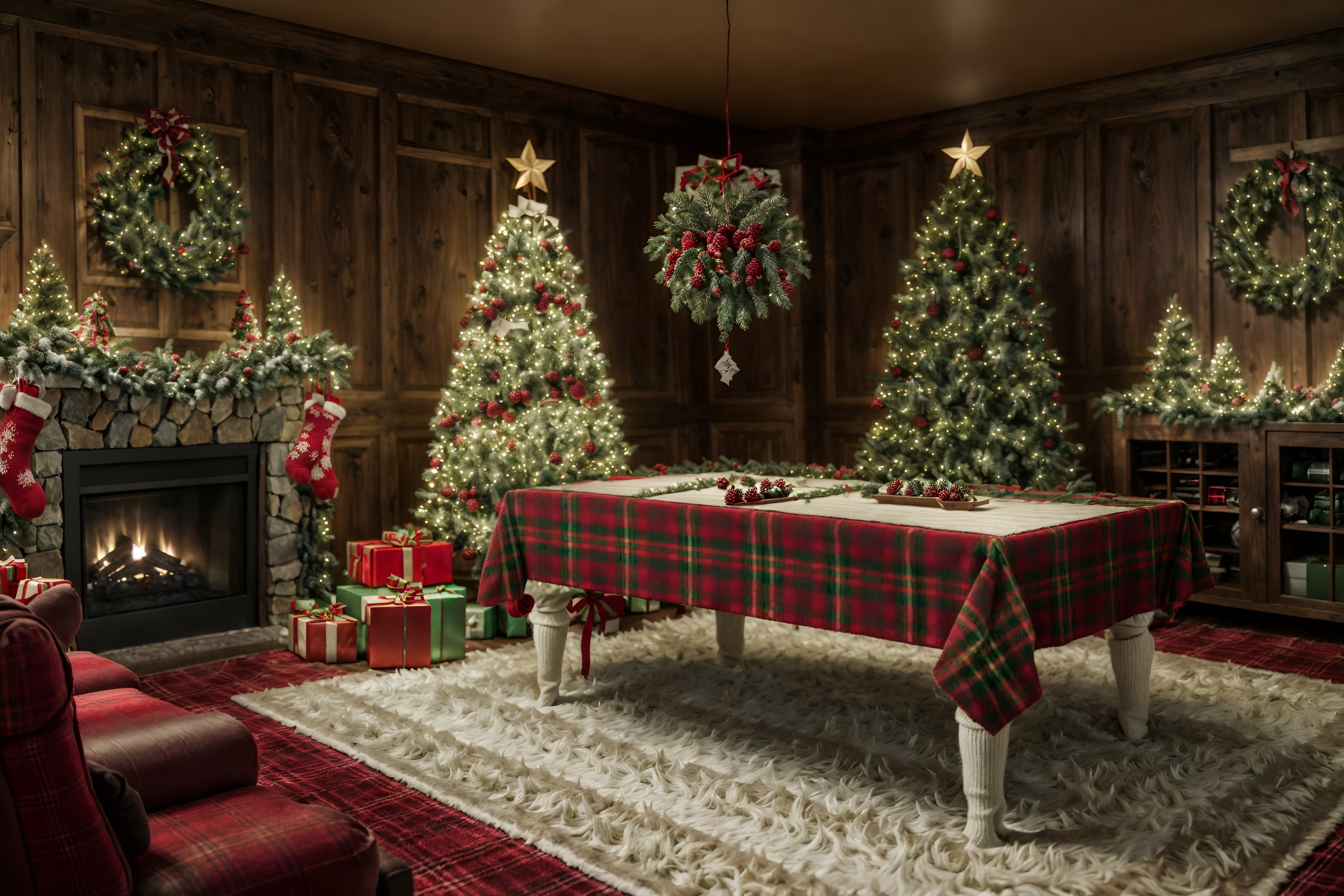 photo from pinterest of christmas-style interior designed (gaming room interior) . with snow outside and plaid rugs and giftwrapped gifts and ribbons and a few big socks hanging and tie pinecones and berries and berries and greenery draped and christmas ornaments. . cinematic photo, highly detailed, cinematic lighting, ultra-detailed, ultrarealistic, photorealism, 8k. trending on pinterest. christmas interior design style. masterpiece, cinematic light, ultrarealistic+, photorealistic+, 8k, raw photo, realistic, sharp focus on eyes, (symmetrical eyes), (intact eyes), hyperrealistic, highest quality, best quality, , highly detailed, masterpiece, best quality, extremely detailed 8k wallpaper, masterpiece, best quality, ultra-detailed, best shadow, detailed background, detailed face, detailed eyes, high contrast, best illumination, detailed face, dulux, caustic, dynamic angle, detailed glow. dramatic lighting. highly detailed, insanely detailed hair, symmetrical, intricate details, professionally retouched, 8k high definition. strong bokeh. award winning photo.