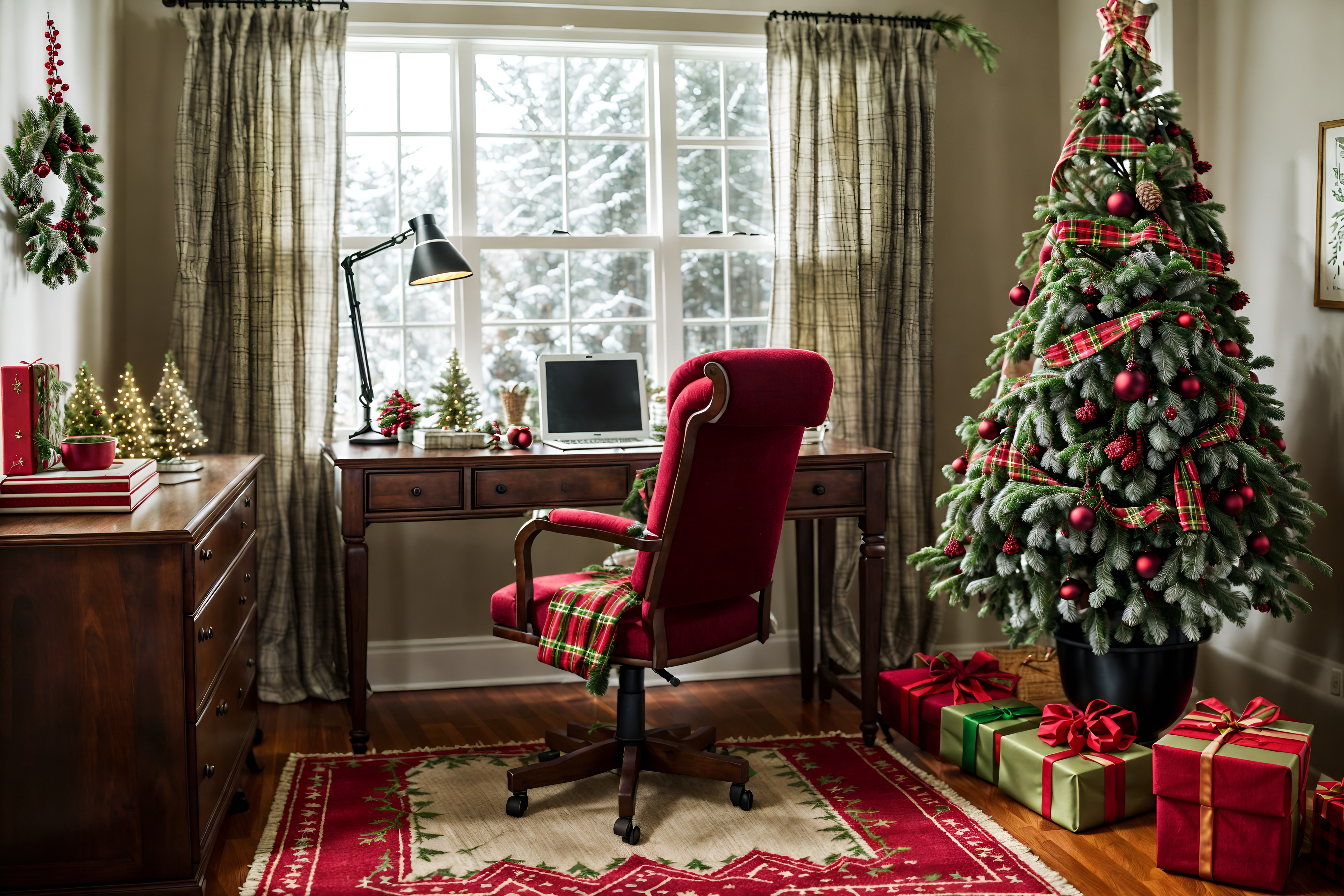 photo from pinterest of christmas-style interior designed (home office interior) with office chair and cabinets and plant and desk lamp and computer desk and office chair. . with a few big socks hanging and tie pinecones and berries and plaid rugs and berries and greenery draped and christmas ornaments and giftwrapped gifts and snow outside and ribbons. . cinematic photo, highly detailed, cinematic lighting, ultra-detailed, ultrarealistic, photorealism, 8k. trending on pinterest. christmas interior design style. masterpiece, cinematic light, ultrarealistic+, photorealistic+, 8k, raw photo, realistic, sharp focus on eyes, (symmetrical eyes), (intact eyes), hyperrealistic, highest quality, best quality, , highly detailed, masterpiece, best quality, extremely detailed 8k wallpaper, masterpiece, best quality, ultra-detailed, best shadow, detailed background, detailed face, detailed eyes, high contrast, best illumination, detailed face, dulux, caustic, dynamic angle, detailed glow. dramatic lighting. highly detailed, insanely detailed hair, symmetrical, intricate details, professionally retouched, 8k high definition. strong bokeh. award winning photo.