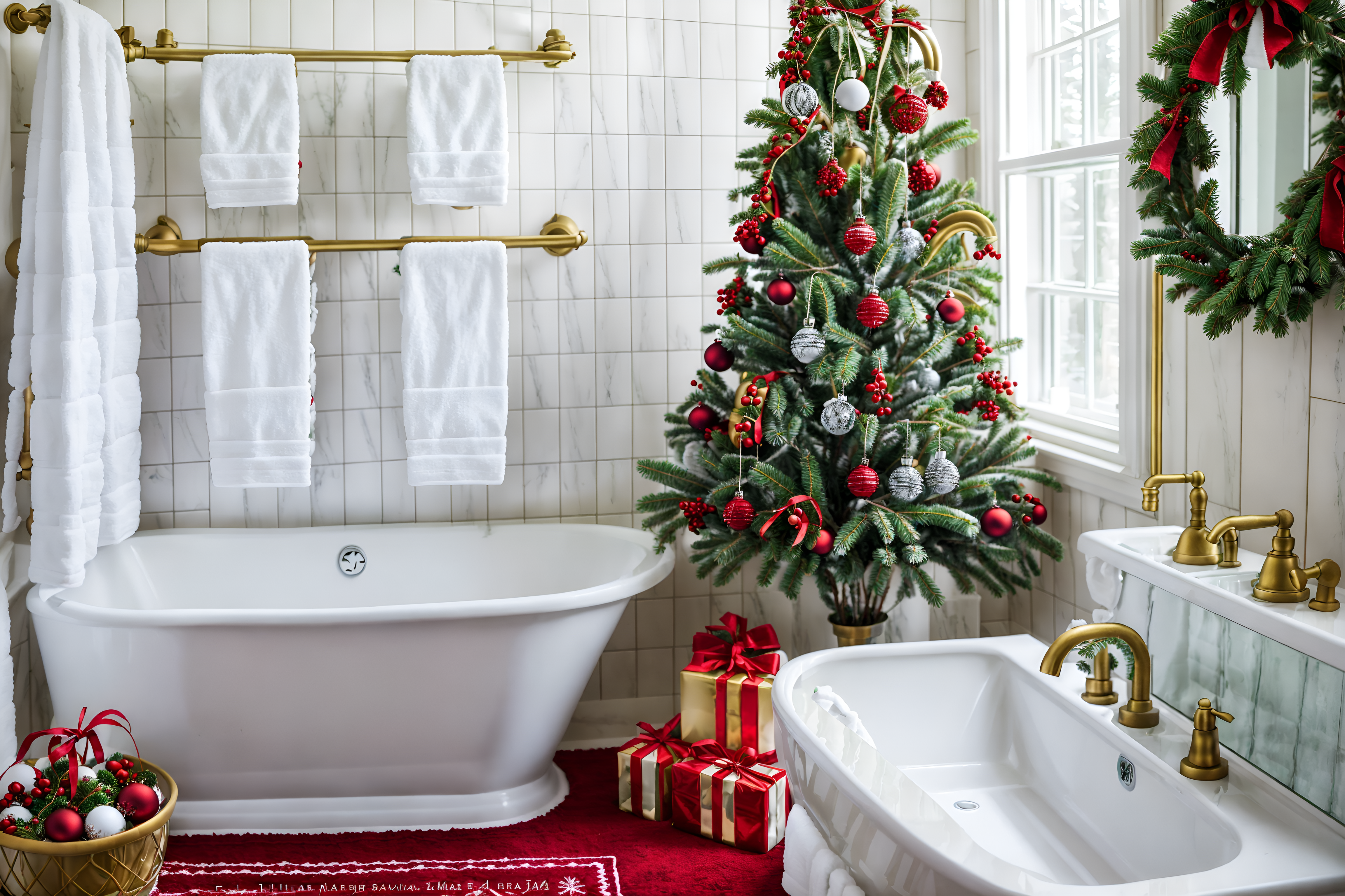 photo from pinterest of christmas-style interior designed (hotel bathroom interior) with bathroom cabinet and bathtub and plant and bathroom sink with faucet and shower and toilet seat and bath rail and mirror. . with christmas ornaments and a few big socks hanging and berries and greenery draped and giftwrapped gifts and plaid rugs and ribbons and snow outside and tie pinecones and berries. . cinematic photo, highly detailed, cinematic lighting, ultra-detailed, ultrarealistic, photorealism, 8k. trending on pinterest. christmas interior design style. masterpiece, cinematic light, ultrarealistic+, photorealistic+, 8k, raw photo, realistic, sharp focus on eyes, (symmetrical eyes), (intact eyes), hyperrealistic, highest quality, best quality, , highly detailed, masterpiece, best quality, extremely detailed 8k wallpaper, masterpiece, best quality, ultra-detailed, best shadow, detailed background, detailed face, detailed eyes, high contrast, best illumination, detailed face, dulux, caustic, dynamic angle, detailed glow. dramatic lighting. highly detailed, insanely detailed hair, symmetrical, intricate details, professionally retouched, 8k high definition. strong bokeh. award winning photo.