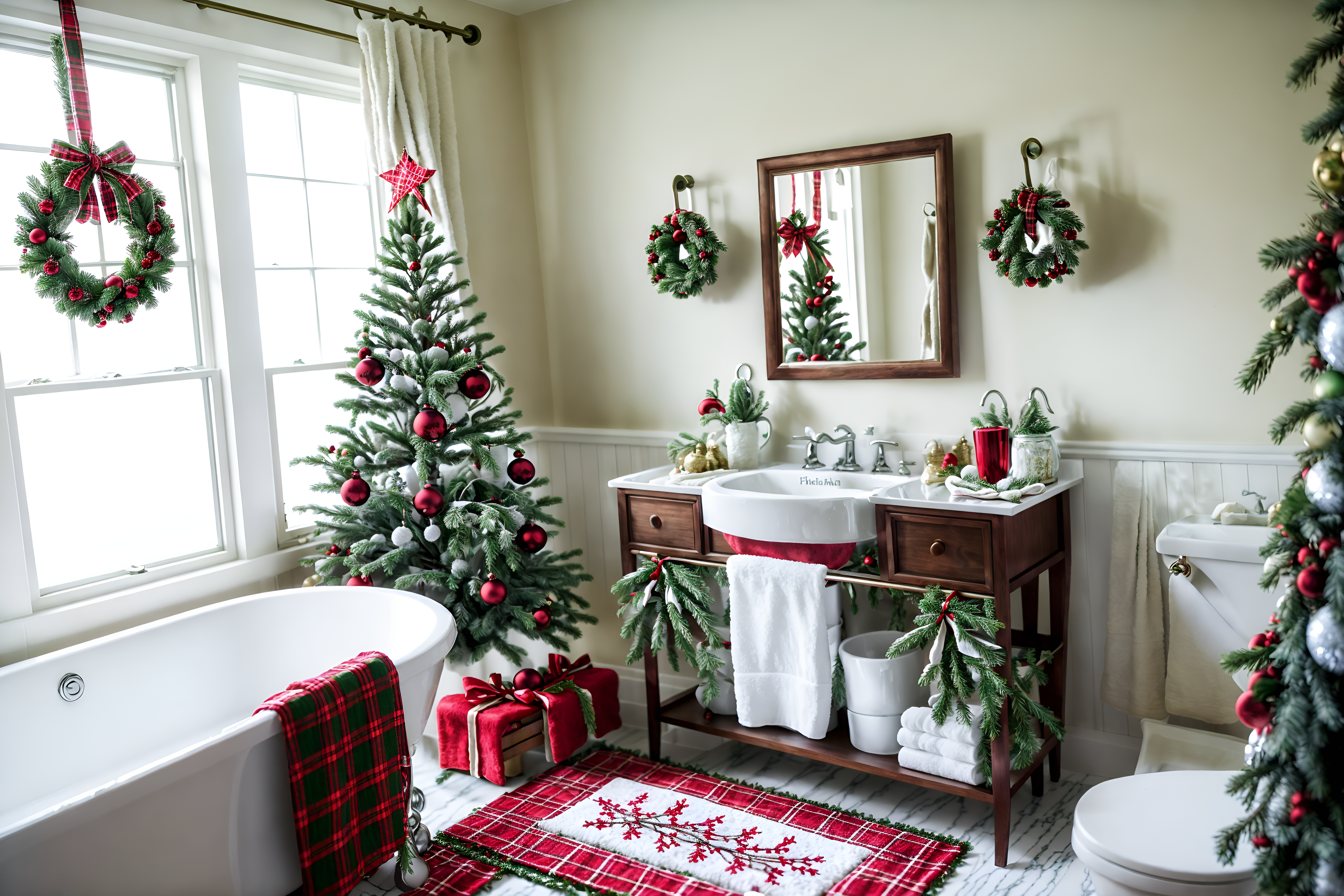 photo from pinterest of christmas-style interior designed (hotel bathroom interior) with bathroom cabinet and bathtub and plant and bathroom sink with faucet and shower and toilet seat and bath rail and mirror. . with christmas ornaments and a few big socks hanging and berries and greenery draped and giftwrapped gifts and plaid rugs and ribbons and snow outside and tie pinecones and berries. . cinematic photo, highly detailed, cinematic lighting, ultra-detailed, ultrarealistic, photorealism, 8k. trending on pinterest. christmas interior design style. masterpiece, cinematic light, ultrarealistic+, photorealistic+, 8k, raw photo, realistic, sharp focus on eyes, (symmetrical eyes), (intact eyes), hyperrealistic, highest quality, best quality, , highly detailed, masterpiece, best quality, extremely detailed 8k wallpaper, masterpiece, best quality, ultra-detailed, best shadow, detailed background, detailed face, detailed eyes, high contrast, best illumination, detailed face, dulux, caustic, dynamic angle, detailed glow. dramatic lighting. highly detailed, insanely detailed hair, symmetrical, intricate details, professionally retouched, 8k high definition. strong bokeh. award winning photo.