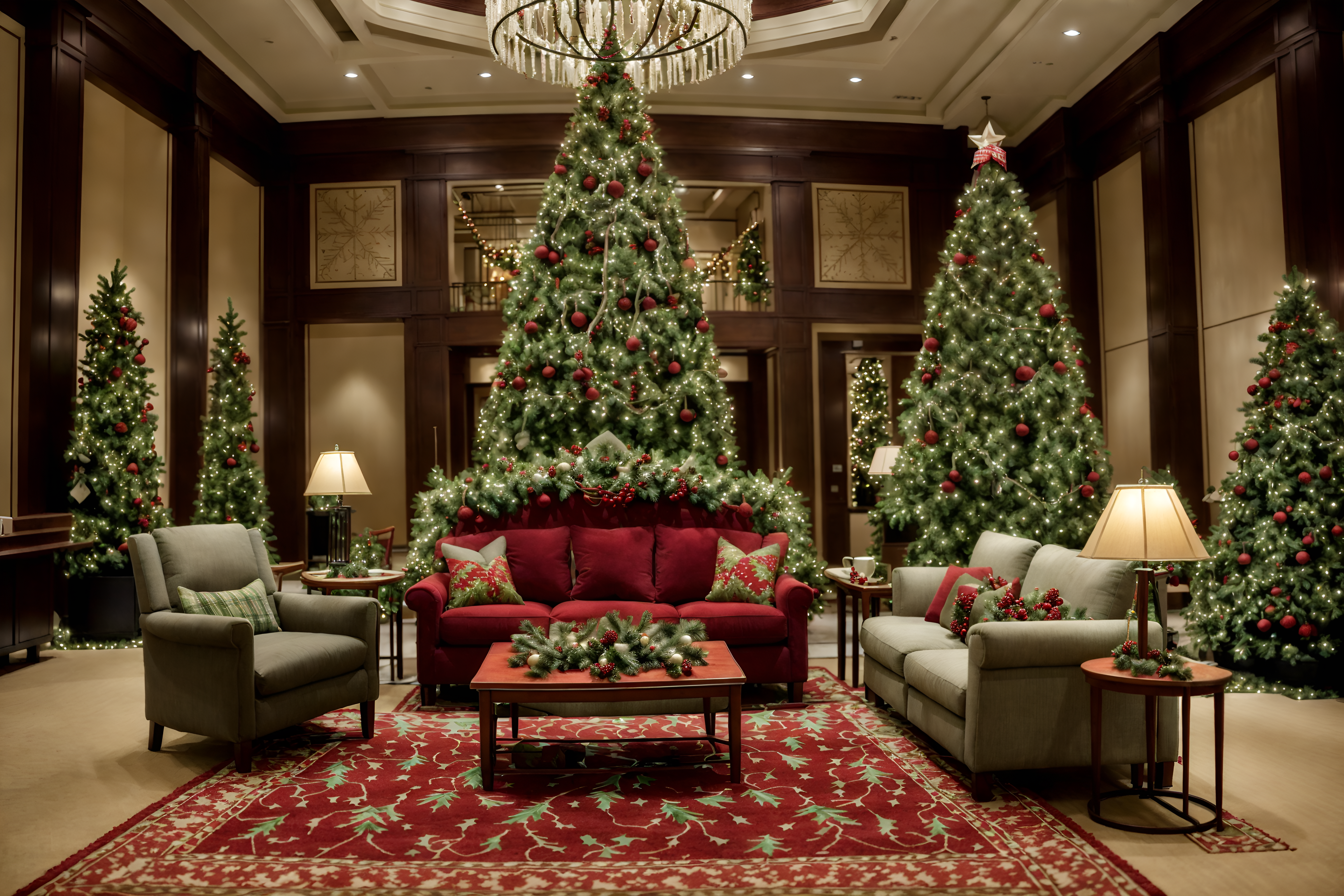 christmas hotel lobbysinterior decorate this hotel lobby with christmas style. . . with lounge chairs and plant and rug and check in desk and sofas and furniture and hanging lamps and coffee tables. . with christmas ornaments and tie pinecones and berries and ribbons and berries and greenery draped and plaid rugs and snow outside and a few big socks hanging and giftwrapped gifts. . .