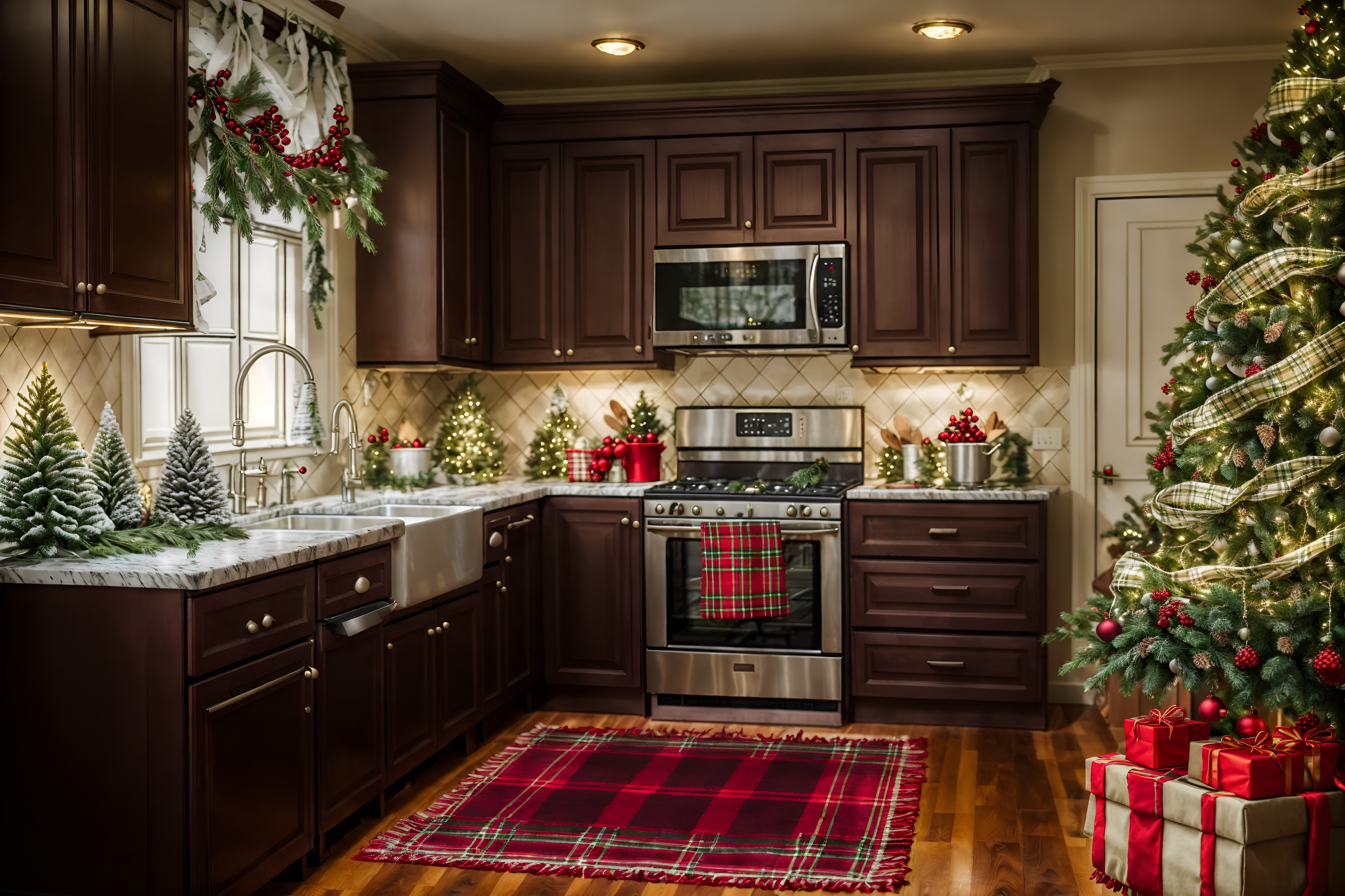 photo from pinterest of christmas-style interior designed (kitchen interior) with stove and kitchen cabinets and plant and worktops and sink and refrigerator and stove. . with snow outside and ribbons and plaid rugs and tie pinecones and berries and giftwrapped gifts and berries and greenery draped and a few big socks hanging and christmas ornaments. . cinematic photo, highly detailed, cinematic lighting, ultra-detailed, ultrarealistic, photorealism, 8k. trending on pinterest. christmas interior design style. masterpiece, cinematic light, ultrarealistic+, photorealistic+, 8k, raw photo, realistic, sharp focus on eyes, (symmetrical eyes), (intact eyes), hyperrealistic, highest quality, best quality, , highly detailed, masterpiece, best quality, extremely detailed 8k wallpaper, masterpiece, best quality, ultra-detailed, best shadow, detailed background, detailed face, detailed eyes, high contrast, best illumination, detailed face, dulux, caustic, dynamic angle, detailed glow. dramatic lighting. highly detailed, insanely detailed hair, symmetrical, intricate details, professionally retouched, 8k high definition. strong bokeh. award winning photo.