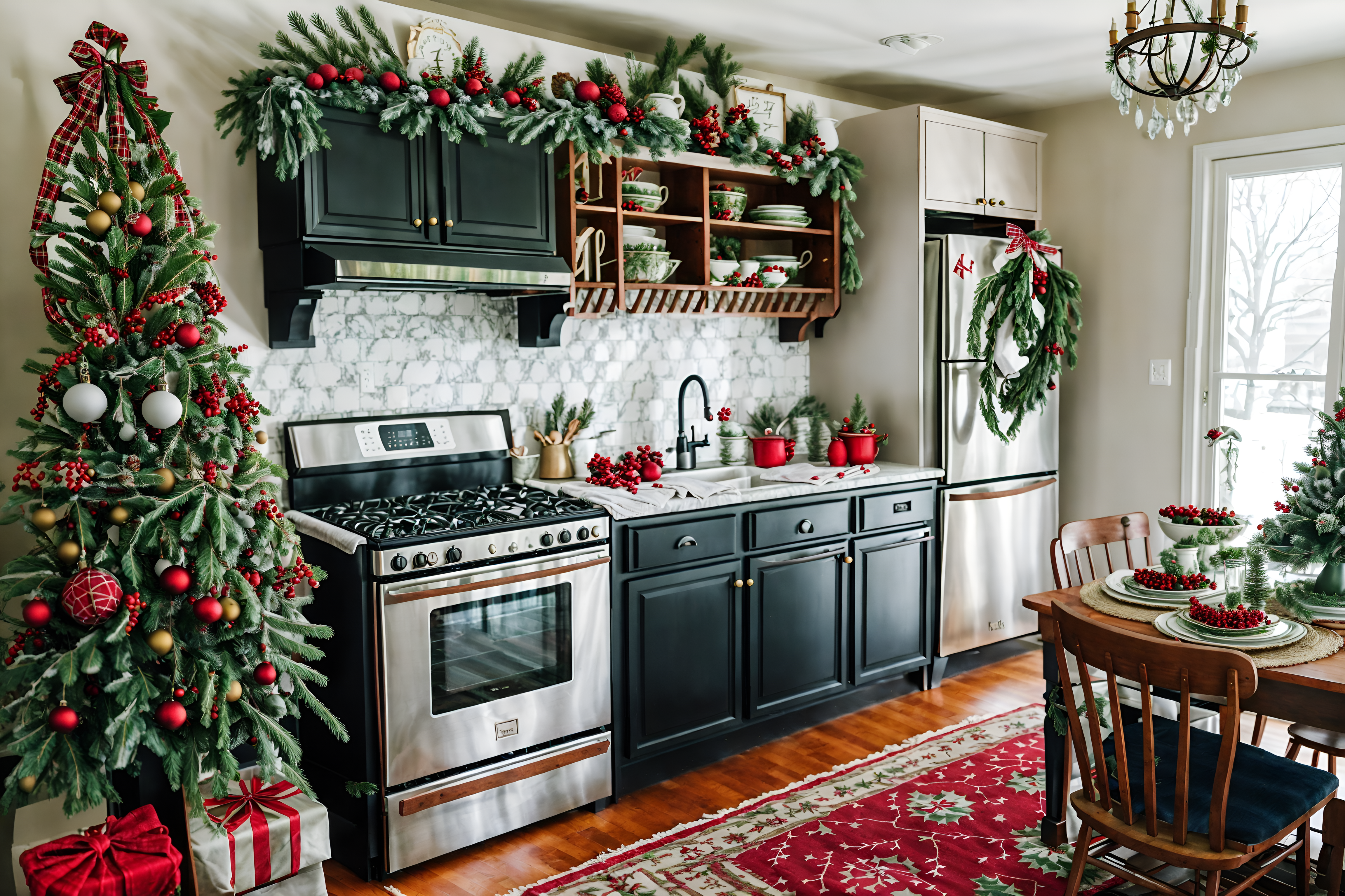 photo from pinterest of christmas-style interior designed (kitchen living combo interior) with furniture and refrigerator and sink and worktops and plant and plant and bookshelves and stove. . with berries and greenery draped and tie pinecones and berries and plaid rugs and a few big socks hanging and ribbons and giftwrapped gifts and snow outside and christmas ornaments. . cinematic photo, highly detailed, cinematic lighting, ultra-detailed, ultrarealistic, photorealism, 8k. trending on pinterest. christmas interior design style. masterpiece, cinematic light, ultrarealistic+, photorealistic+, 8k, raw photo, realistic, sharp focus on eyes, (symmetrical eyes), (intact eyes), hyperrealistic, highest quality, best quality, , highly detailed, masterpiece, best quality, extremely detailed 8k wallpaper, masterpiece, best quality, ultra-detailed, best shadow, detailed background, detailed face, detailed eyes, high contrast, best illumination, detailed face, dulux, caustic, dynamic angle, detailed glow. dramatic lighting. highly detailed, insanely detailed hair, symmetrical, intricate details, professionally retouched, 8k high definition. strong bokeh. award winning photo.