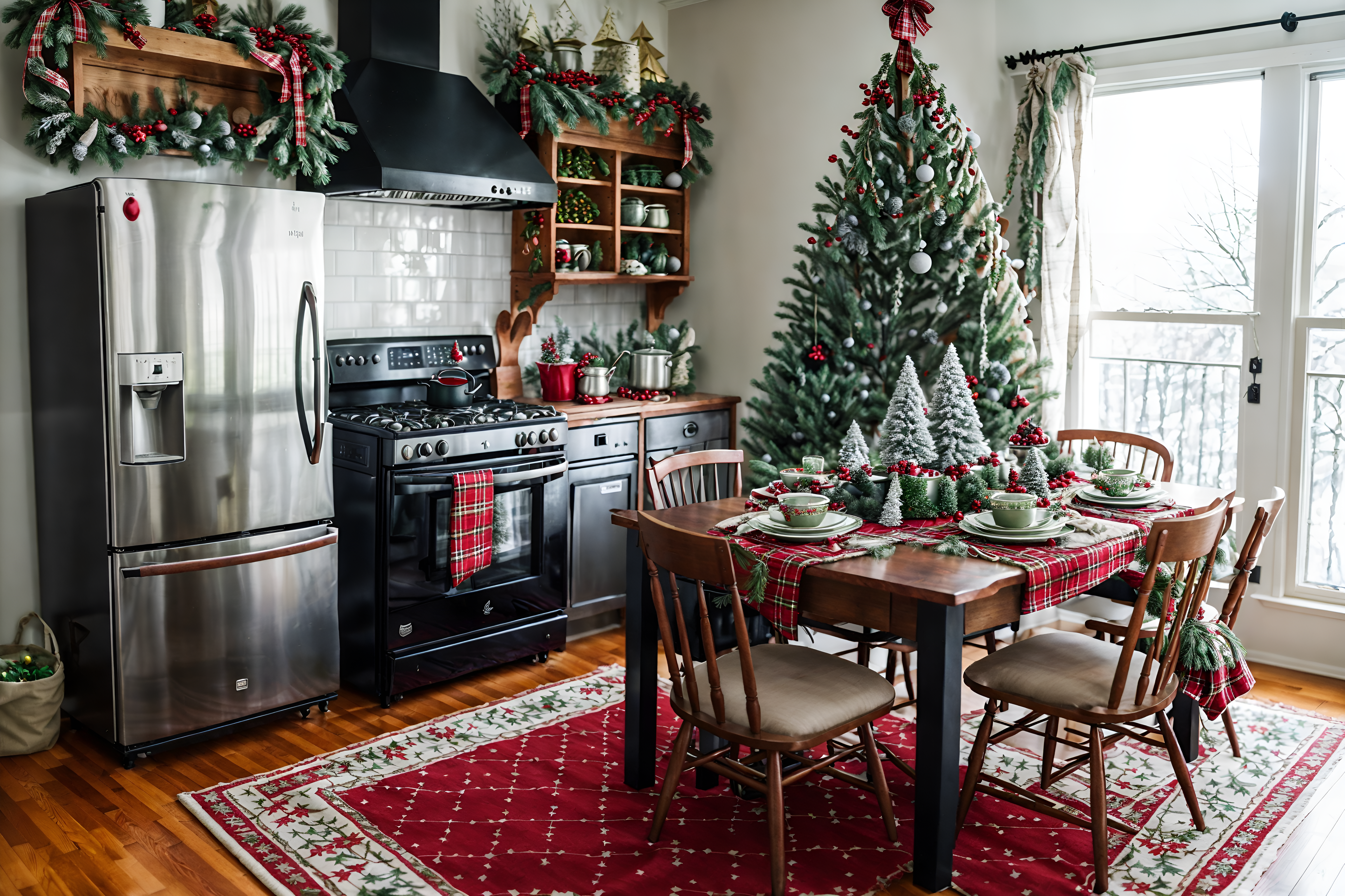 photo from pinterest of christmas-style interior designed (kitchen living combo interior) with furniture and refrigerator and sink and worktops and plant and plant and bookshelves and stove. . with berries and greenery draped and tie pinecones and berries and plaid rugs and a few big socks hanging and ribbons and giftwrapped gifts and snow outside and christmas ornaments. . cinematic photo, highly detailed, cinematic lighting, ultra-detailed, ultrarealistic, photorealism, 8k. trending on pinterest. christmas interior design style. masterpiece, cinematic light, ultrarealistic+, photorealistic+, 8k, raw photo, realistic, sharp focus on eyes, (symmetrical eyes), (intact eyes), hyperrealistic, highest quality, best quality, , highly detailed, masterpiece, best quality, extremely detailed 8k wallpaper, masterpiece, best quality, ultra-detailed, best shadow, detailed background, detailed face, detailed eyes, high contrast, best illumination, detailed face, dulux, caustic, dynamic angle, detailed glow. dramatic lighting. highly detailed, insanely detailed hair, symmetrical, intricate details, professionally retouched, 8k high definition. strong bokeh. award winning photo.