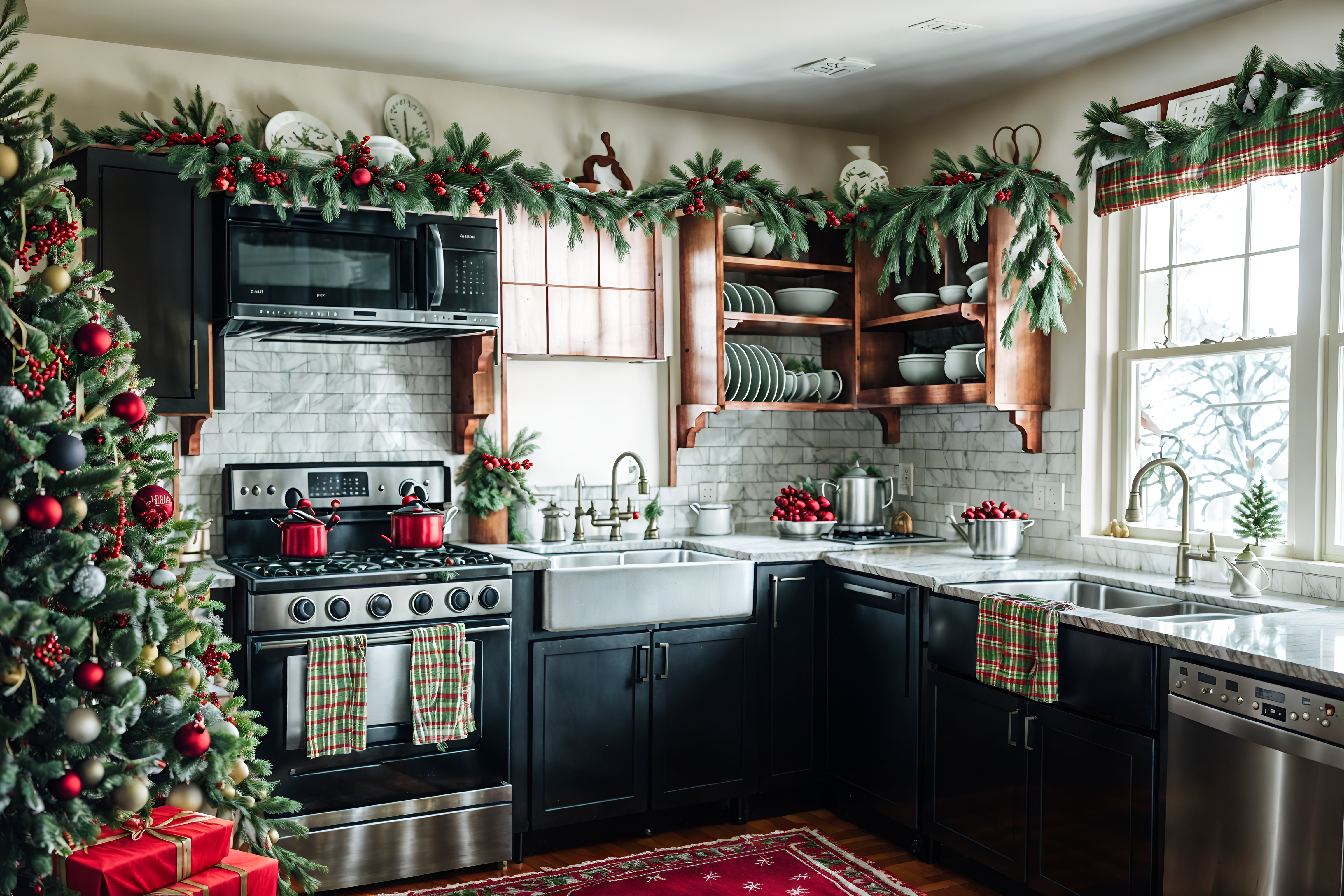 photo from pinterest of christmas-style interior designed (kitchen living combo interior) with furniture and refrigerator and sink and worktops and plant and plant and bookshelves and stove. . with berries and greenery draped and tie pinecones and berries and plaid rugs and a few big socks hanging and ribbons and giftwrapped gifts and snow outside and christmas ornaments. . cinematic photo, highly detailed, cinematic lighting, ultra-detailed, ultrarealistic, photorealism, 8k. trending on pinterest. christmas interior design style. masterpiece, cinematic light, ultrarealistic+, photorealistic+, 8k, raw photo, realistic, sharp focus on eyes, (symmetrical eyes), (intact eyes), hyperrealistic, highest quality, best quality, , highly detailed, masterpiece, best quality, extremely detailed 8k wallpaper, masterpiece, best quality, ultra-detailed, best shadow, detailed background, detailed face, detailed eyes, high contrast, best illumination, detailed face, dulux, caustic, dynamic angle, detailed glow. dramatic lighting. highly detailed, insanely detailed hair, symmetrical, intricate details, professionally retouched, 8k high definition. strong bokeh. award winning photo.
