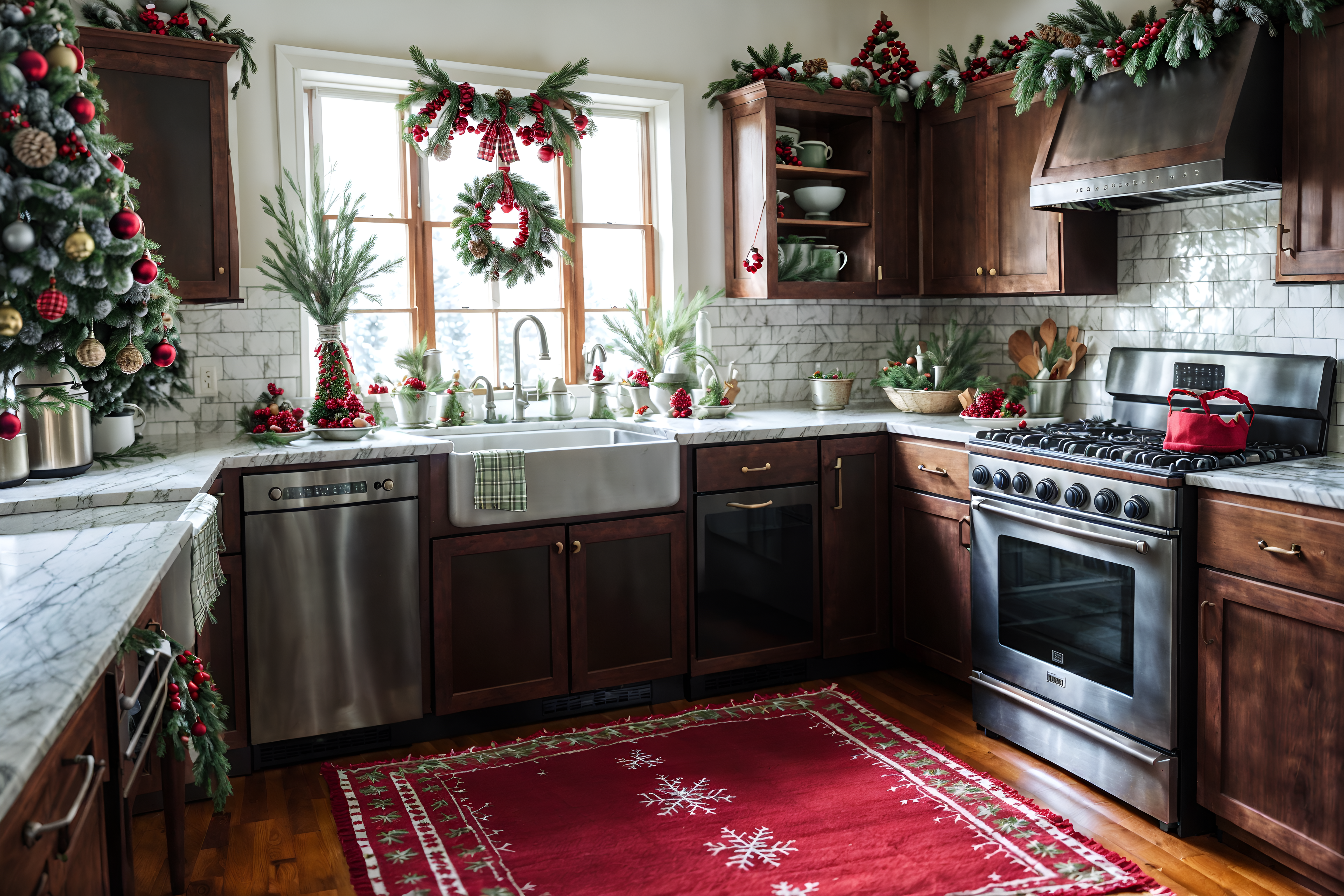 photo from pinterest of christmas-style interior designed (kitchen living combo interior) with furniture and refrigerator and sink and worktops and plant and plant and bookshelves and stove. . with berries and greenery draped and tie pinecones and berries and plaid rugs and a few big socks hanging and ribbons and giftwrapped gifts and snow outside and christmas ornaments. . cinematic photo, highly detailed, cinematic lighting, ultra-detailed, ultrarealistic, photorealism, 8k. trending on pinterest. christmas interior design style. masterpiece, cinematic light, ultrarealistic+, photorealistic+, 8k, raw photo, realistic, sharp focus on eyes, (symmetrical eyes), (intact eyes), hyperrealistic, highest quality, best quality, , highly detailed, masterpiece, best quality, extremely detailed 8k wallpaper, masterpiece, best quality, ultra-detailed, best shadow, detailed background, detailed face, detailed eyes, high contrast, best illumination, detailed face, dulux, caustic, dynamic angle, detailed glow. dramatic lighting. highly detailed, insanely detailed hair, symmetrical, intricate details, professionally retouched, 8k high definition. strong bokeh. award winning photo.