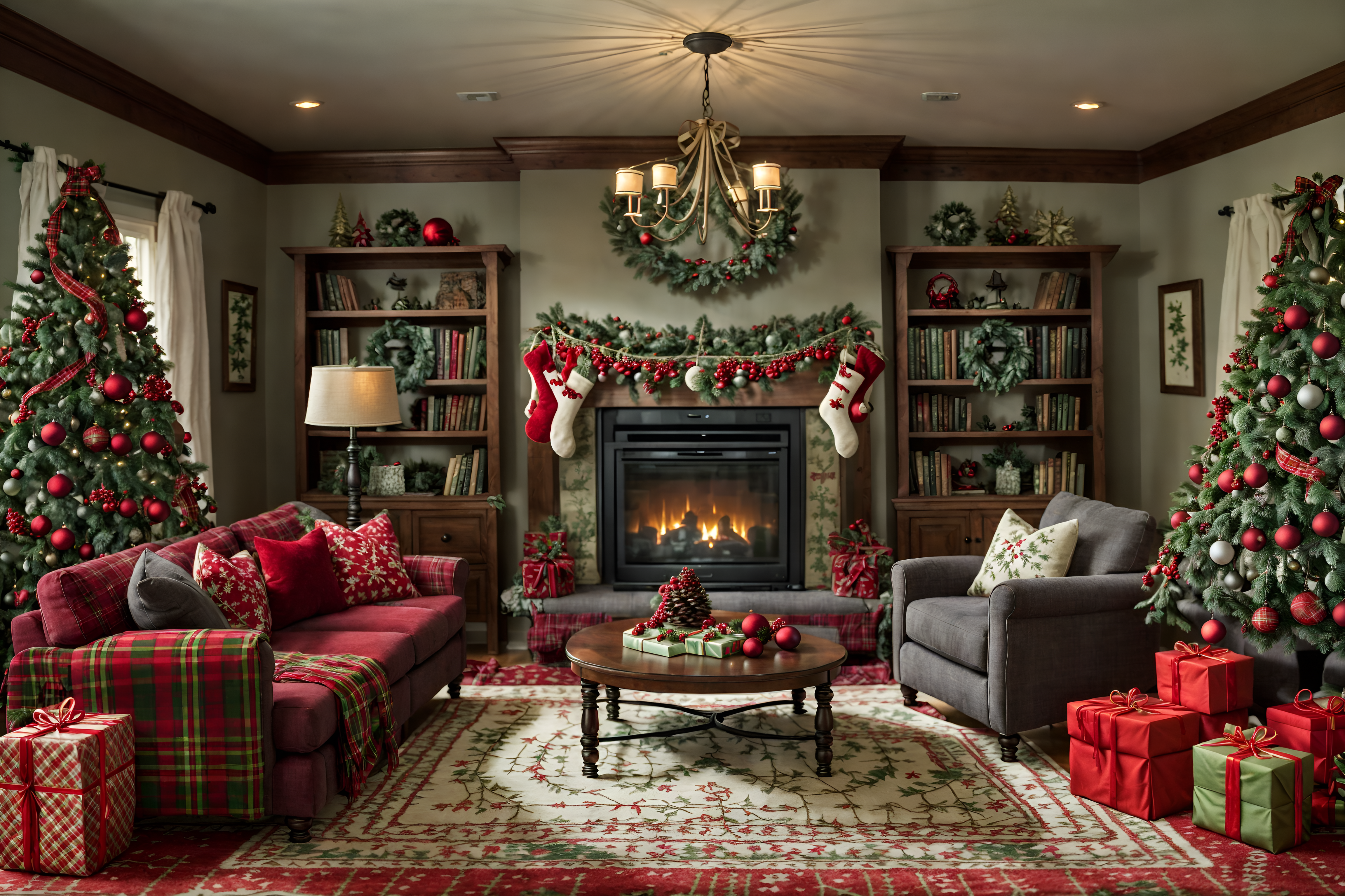 photo from pinterest of christmas-style interior designed (living room interior) with occasional tables and televisions and chairs and electric lamps and rug and sofa and furniture and bookshelves. . with a few big socks hanging and plaid rugs and christmas ornaments and snow outside and tie pinecones and berries and giftwrapped gifts and ribbons and berries and greenery draped. . cinematic photo, highly detailed, cinematic lighting, ultra-detailed, ultrarealistic, photorealism, 8k. trending on pinterest. christmas interior design style. masterpiece, cinematic light, ultrarealistic+, photorealistic+, 8k, raw photo, realistic, sharp focus on eyes, (symmetrical eyes), (intact eyes), hyperrealistic, highest quality, best quality, , highly detailed, masterpiece, best quality, extremely detailed 8k wallpaper, masterpiece, best quality, ultra-detailed, best shadow, detailed background, detailed face, detailed eyes, high contrast, best illumination, detailed face, dulux, caustic, dynamic angle, detailed glow. dramatic lighting. highly detailed, insanely detailed hair, symmetrical, intricate details, professionally retouched, 8k high definition. strong bokeh. award winning photo.