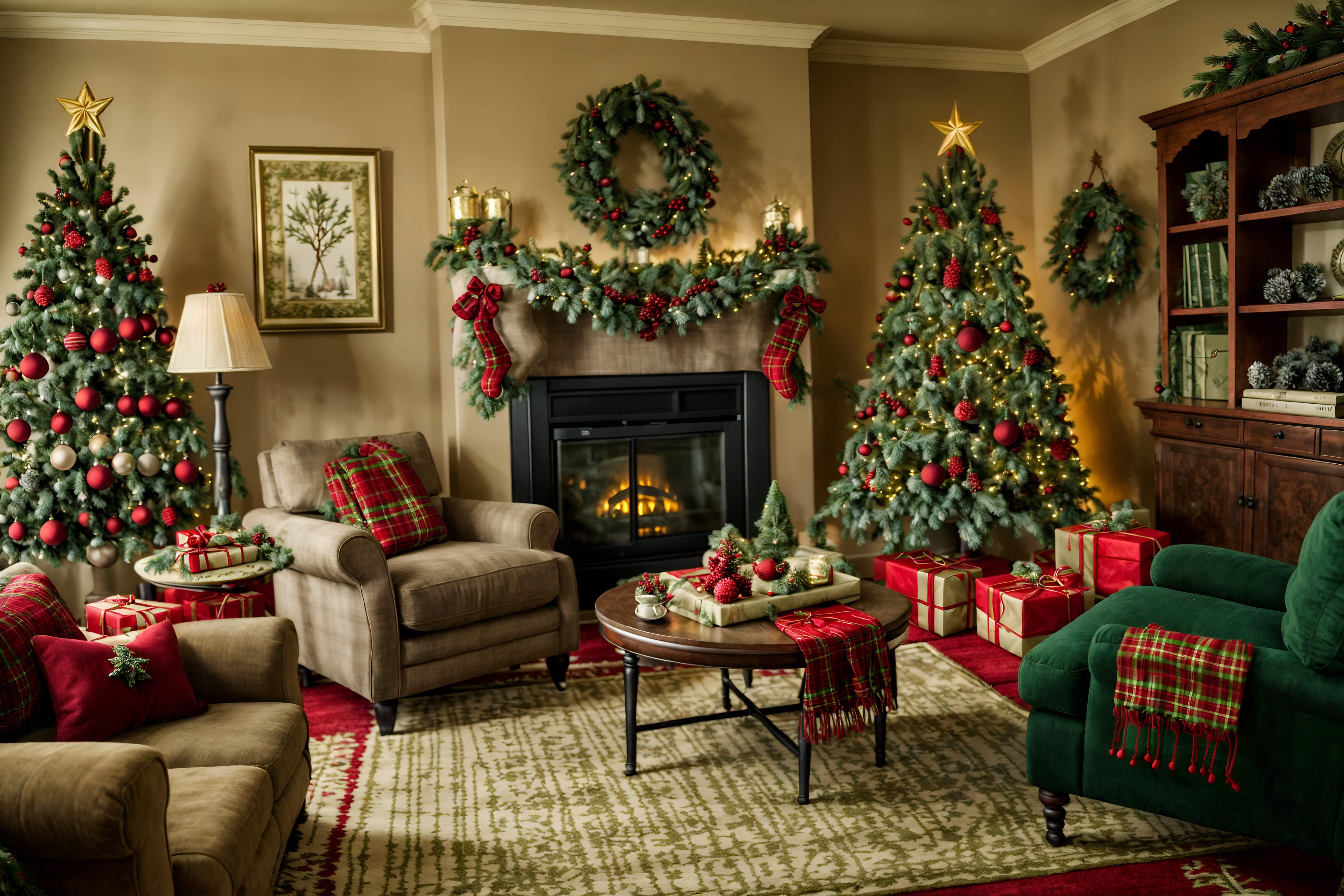 photo from pinterest of christmas-style interior designed (living room interior) with occasional tables and televisions and chairs and electric lamps and rug and sofa and furniture and bookshelves. . with a few big socks hanging and plaid rugs and christmas ornaments and snow outside and tie pinecones and berries and giftwrapped gifts and ribbons and berries and greenery draped. . cinematic photo, highly detailed, cinematic lighting, ultra-detailed, ultrarealistic, photorealism, 8k. trending on pinterest. christmas interior design style. masterpiece, cinematic light, ultrarealistic+, photorealistic+, 8k, raw photo, realistic, sharp focus on eyes, (symmetrical eyes), (intact eyes), hyperrealistic, highest quality, best quality, , highly detailed, masterpiece, best quality, extremely detailed 8k wallpaper, masterpiece, best quality, ultra-detailed, best shadow, detailed background, detailed face, detailed eyes, high contrast, best illumination, detailed face, dulux, caustic, dynamic angle, detailed glow. dramatic lighting. highly detailed, insanely detailed hair, symmetrical, intricate details, professionally retouched, 8k high definition. strong bokeh. award winning photo.