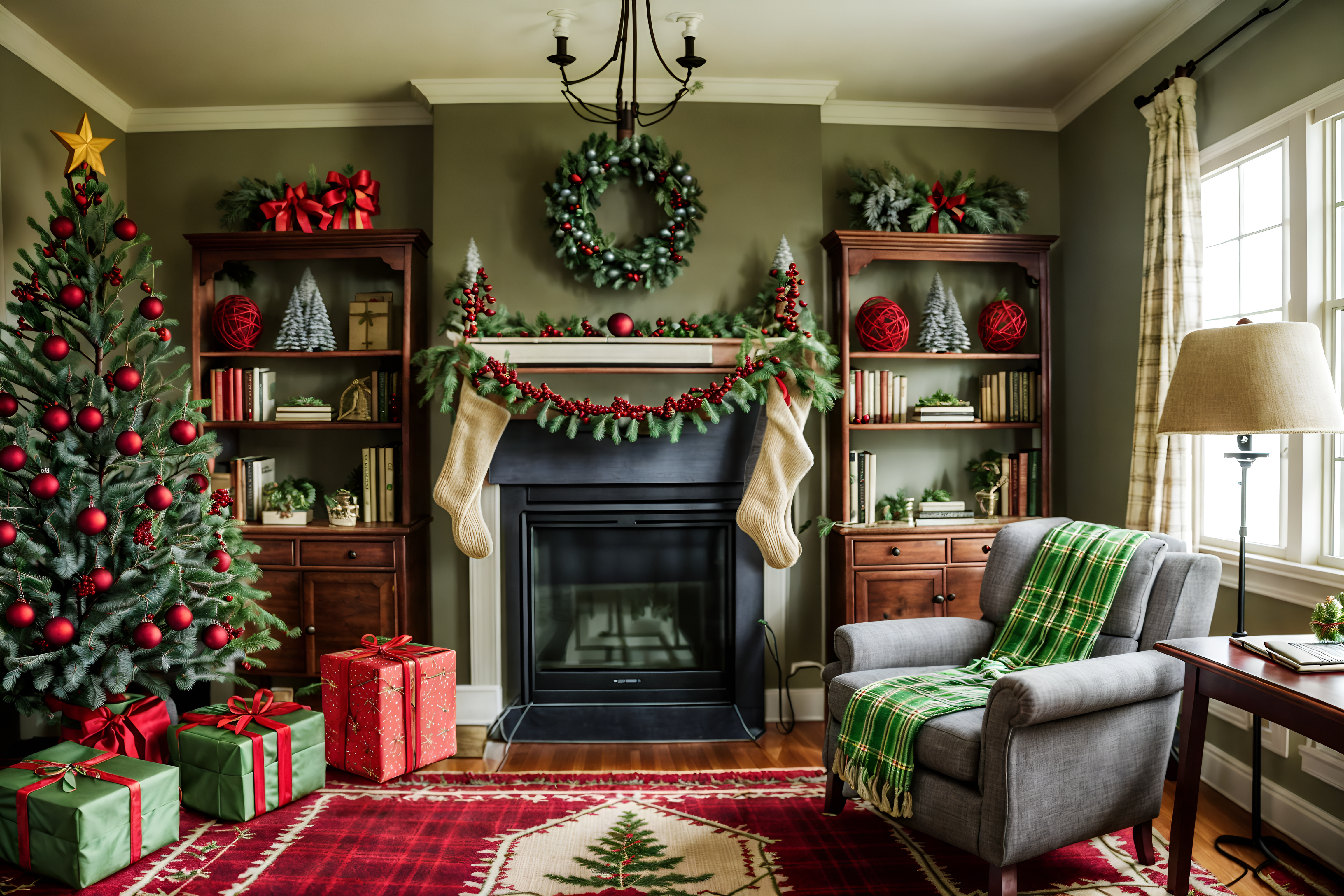 photo from pinterest of christmas-style interior designed (study room interior) with lounge chair and desk lamp and writing desk and cabinets and bookshelves and office chair and plant and lounge chair. . with berries and greenery draped and giftwrapped gifts and snow outside and ribbons and plaid rugs and a few big socks hanging and tie pinecones and berries and christmas ornaments. . cinematic photo, highly detailed, cinematic lighting, ultra-detailed, ultrarealistic, photorealism, 8k. trending on pinterest. christmas interior design style. masterpiece, cinematic light, ultrarealistic+, photorealistic+, 8k, raw photo, realistic, sharp focus on eyes, (symmetrical eyes), (intact eyes), hyperrealistic, highest quality, best quality, , highly detailed, masterpiece, best quality, extremely detailed 8k wallpaper, masterpiece, best quality, ultra-detailed, best shadow, detailed background, detailed face, detailed eyes, high contrast, best illumination, detailed face, dulux, caustic, dynamic angle, detailed glow. dramatic lighting. highly detailed, insanely detailed hair, symmetrical, intricate details, professionally retouched, 8k high definition. strong bokeh. award winning photo.