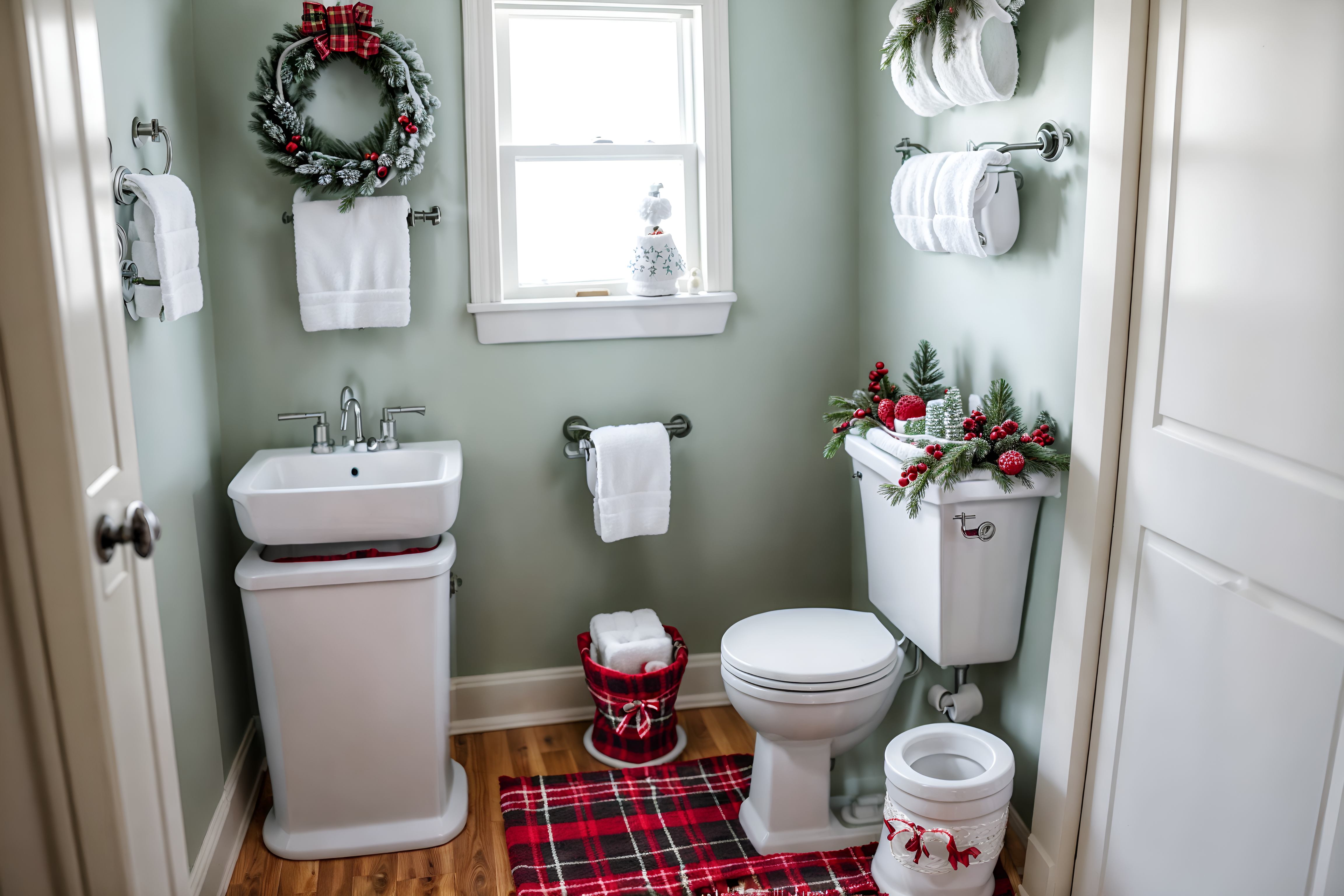 christmas toiletsinterior decorate this toilet with christmas style. . . with toilet paper hanger and toilet with toilet seat up and sink with tap and toilet paper hanger. . with giftwrapped gifts and christmas ornaments and snow outside and tie pinecones and berries and berries and greenery draped and a few big socks hanging and ribbons and plaid rugs. . .
