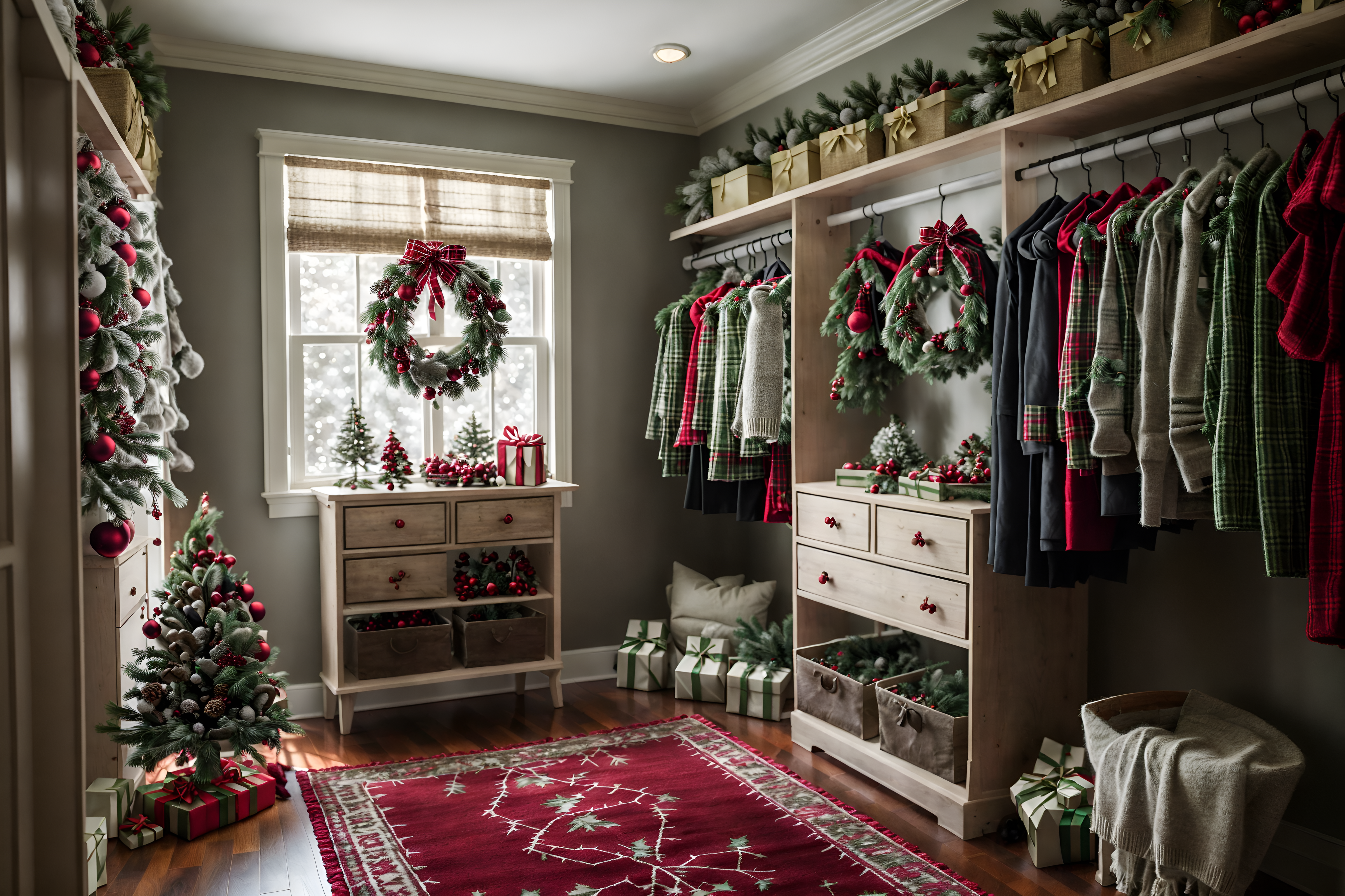 photo from pinterest of christmas-style interior designed (walk in closet interior) . with tie pinecones and berries and berries and greenery draped and plaid rugs and ribbons and a few big socks hanging and christmas ornaments and snow outside and giftwrapped gifts. . cinematic photo, highly detailed, cinematic lighting, ultra-detailed, ultrarealistic, photorealism, 8k. trending on pinterest. christmas interior design style. masterpiece, cinematic light, ultrarealistic+, photorealistic+, 8k, raw photo, realistic, sharp focus on eyes, (symmetrical eyes), (intact eyes), hyperrealistic, highest quality, best quality, , highly detailed, masterpiece, best quality, extremely detailed 8k wallpaper, masterpiece, best quality, ultra-detailed, best shadow, detailed background, detailed face, detailed eyes, high contrast, best illumination, detailed face, dulux, caustic, dynamic angle, detailed glow. dramatic lighting. highly detailed, insanely detailed hair, symmetrical, intricate details, professionally retouched, 8k high definition. strong bokeh. award winning photo.