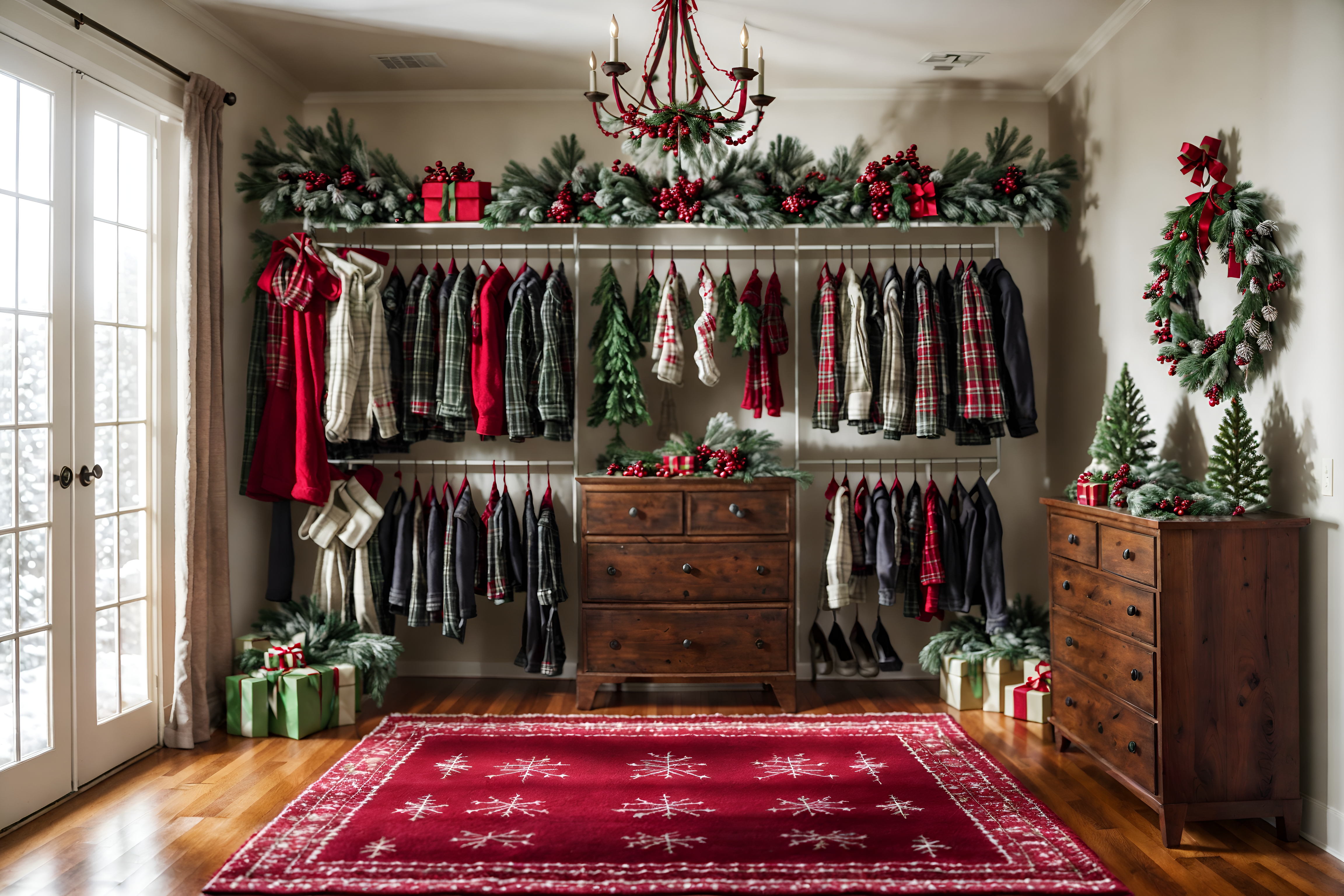 photo from pinterest of christmas-style interior designed (walk in closet interior) . with tie pinecones and berries and berries and greenery draped and plaid rugs and ribbons and a few big socks hanging and christmas ornaments and snow outside and giftwrapped gifts. . cinematic photo, highly detailed, cinematic lighting, ultra-detailed, ultrarealistic, photorealism, 8k. trending on pinterest. christmas interior design style. masterpiece, cinematic light, ultrarealistic+, photorealistic+, 8k, raw photo, realistic, sharp focus on eyes, (symmetrical eyes), (intact eyes), hyperrealistic, highest quality, best quality, , highly detailed, masterpiece, best quality, extremely detailed 8k wallpaper, masterpiece, best quality, ultra-detailed, best shadow, detailed background, detailed face, detailed eyes, high contrast, best illumination, detailed face, dulux, caustic, dynamic angle, detailed glow. dramatic lighting. highly detailed, insanely detailed hair, symmetrical, intricate details, professionally retouched, 8k high definition. strong bokeh. award winning photo.