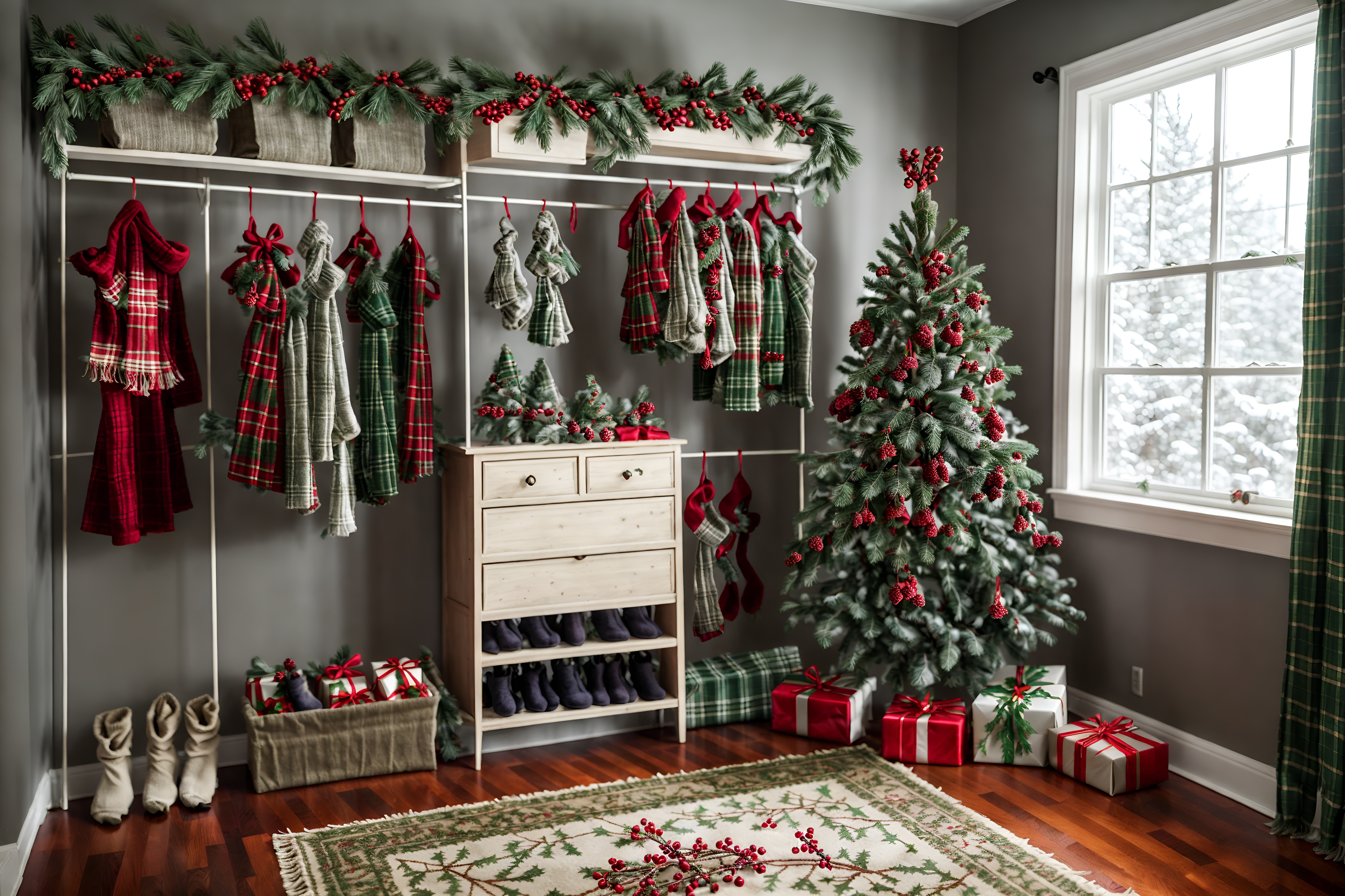 photo from pinterest of christmas-style interior designed (walk in closet interior) . with tie pinecones and berries and berries and greenery draped and plaid rugs and ribbons and a few big socks hanging and christmas ornaments and snow outside and giftwrapped gifts. . cinematic photo, highly detailed, cinematic lighting, ultra-detailed, ultrarealistic, photorealism, 8k. trending on pinterest. christmas interior design style. masterpiece, cinematic light, ultrarealistic+, photorealistic+, 8k, raw photo, realistic, sharp focus on eyes, (symmetrical eyes), (intact eyes), hyperrealistic, highest quality, best quality, , highly detailed, masterpiece, best quality, extremely detailed 8k wallpaper, masterpiece, best quality, ultra-detailed, best shadow, detailed background, detailed face, detailed eyes, high contrast, best illumination, detailed face, dulux, caustic, dynamic angle, detailed glow. dramatic lighting. highly detailed, insanely detailed hair, symmetrical, intricate details, professionally retouched, 8k high definition. strong bokeh. award winning photo.