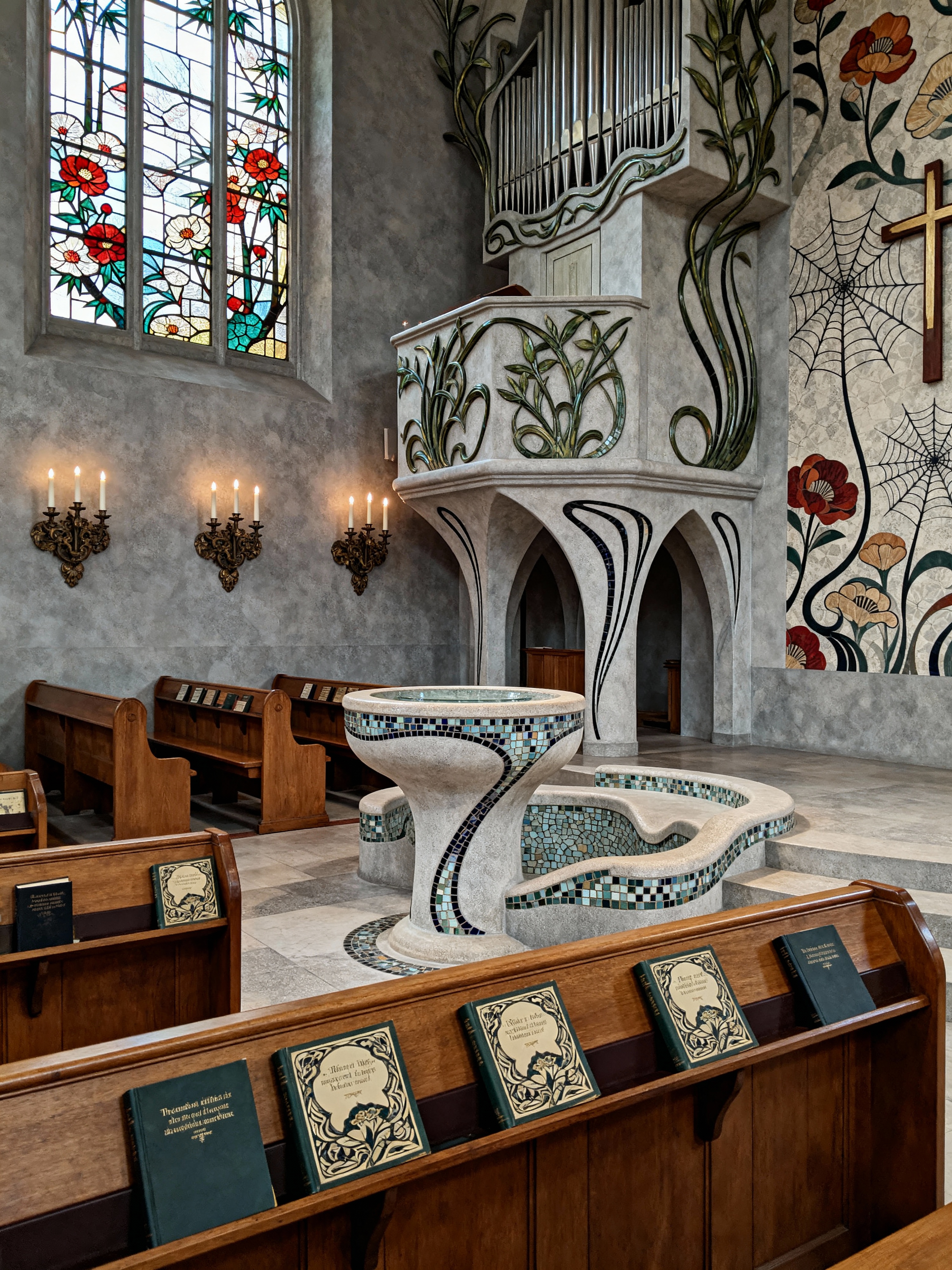 church with art nouveau style with hymn books and stained glass windows and candles and baptismal font and organ and pews and cross and pulpit. . with japanese motifs and curving, plant-like embellishments and ashy colors and mosaics and asymmetrical shapes and wallpaper patterns of stylized flowers and arches and curved forms and wallpaper pattners of spider webs