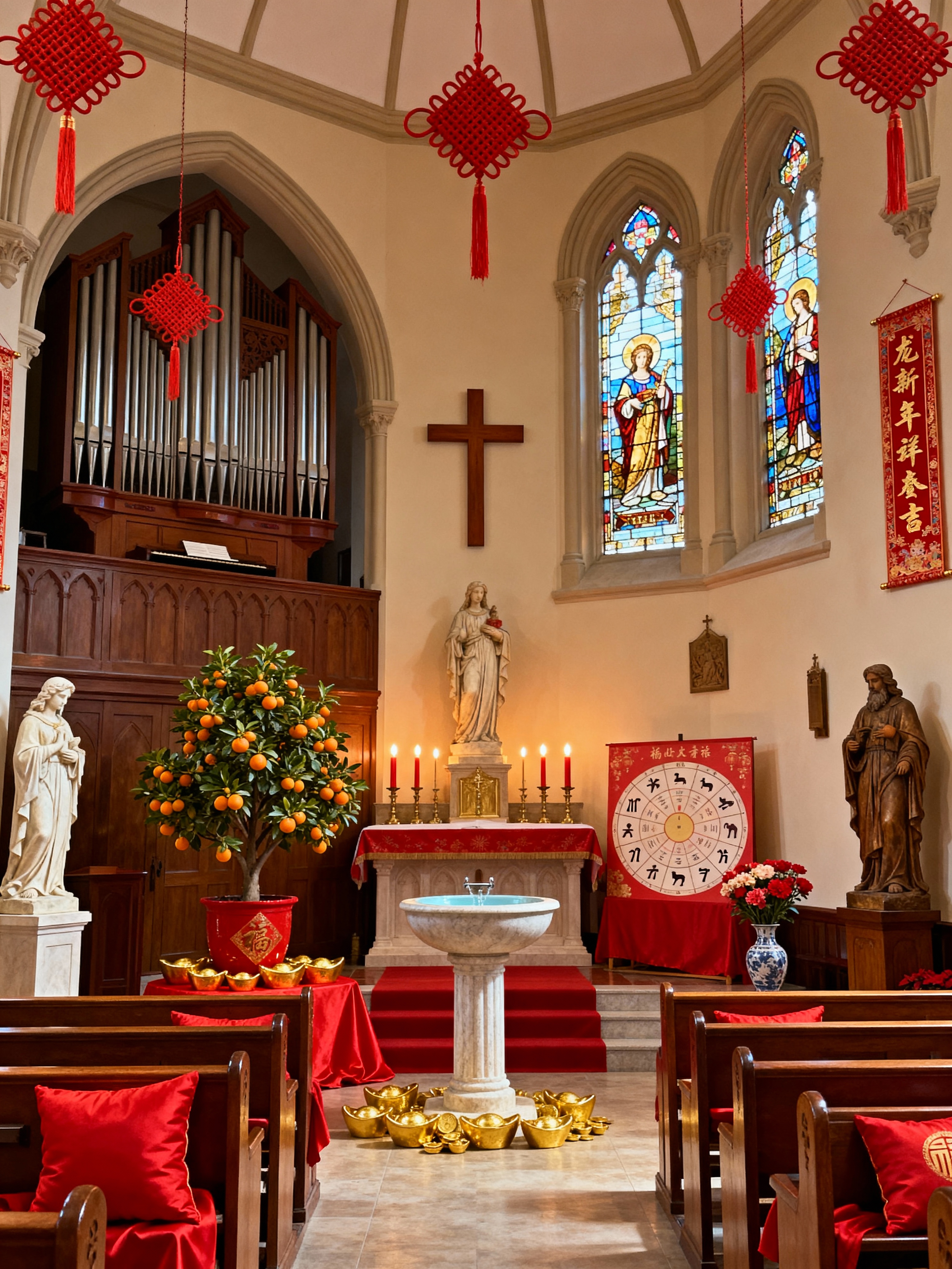 church with chinese new year style with organ and cross and stained glass windows and pews and baptismal font and religious statues and candles and altar. . with red fabric & pillows and money tree and gold ingots and kumquat trees and chinese knots and fai chun banners and mei hwa flowers and zodiac calendar
