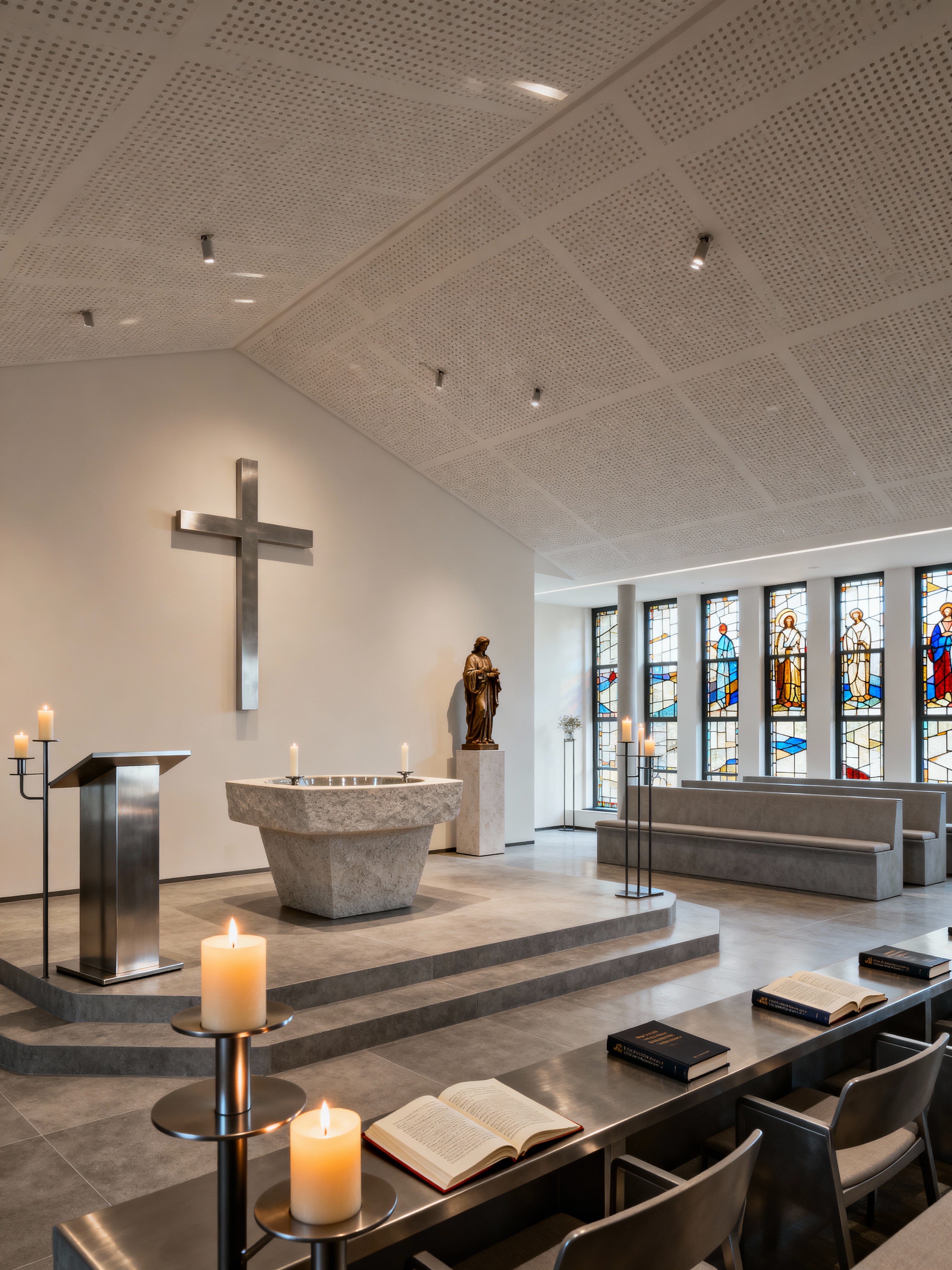 church with contemporary style with candles and baptismal font and religious statues and pulpit and hymn books and pews and stained glass windows and cross. . with functional design and metal accents and elegant simplicity and clean look and sleek lines and minimalist and neutral palette and open spaces