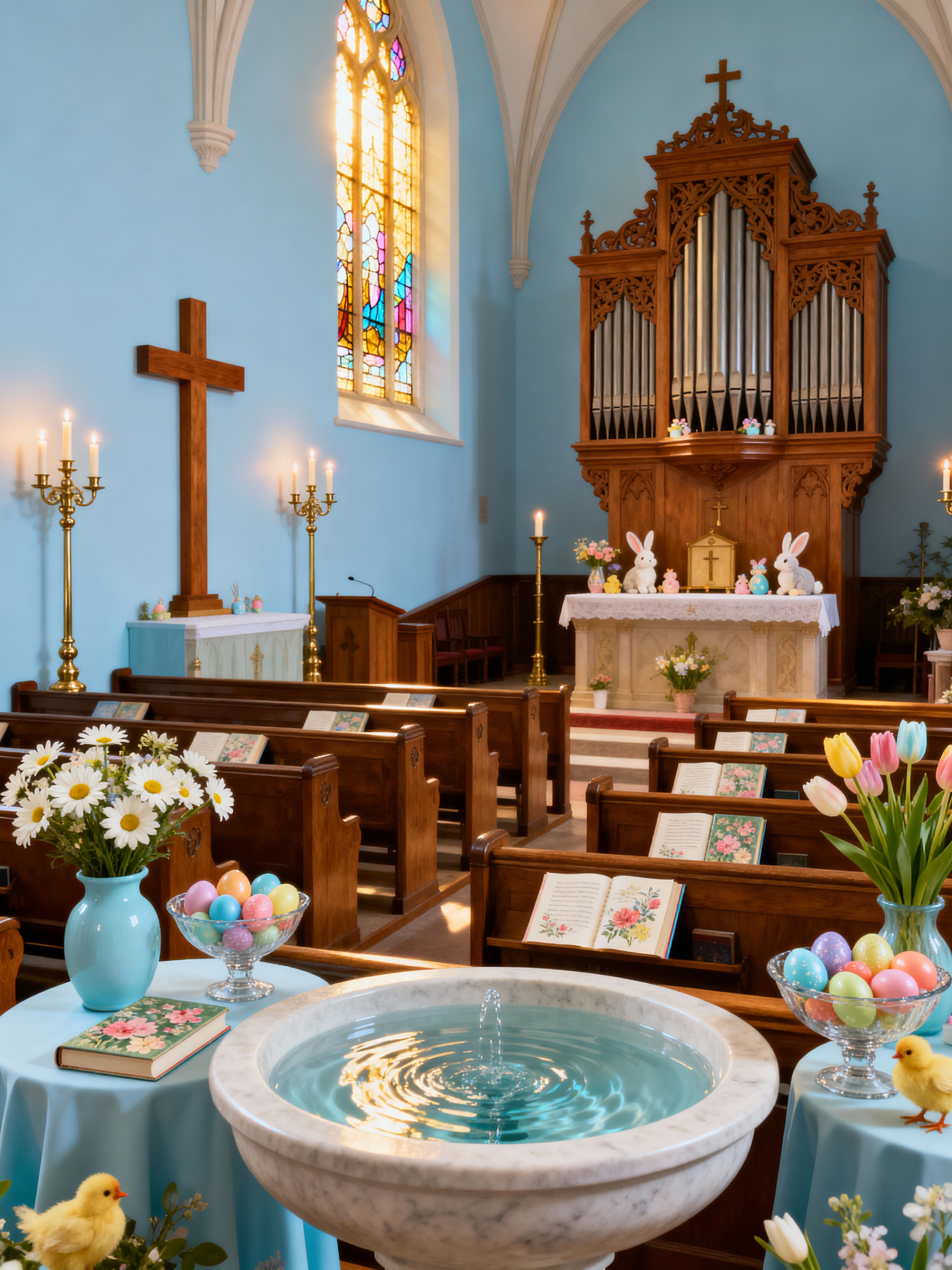 church with easter style with altar and organ and cross and pews and stained glass windows and candles and hymn books and baptismal font. . with light blue colors and spring decorations and colorful easter eggs and easter decorations and flowers on table and light blue colors