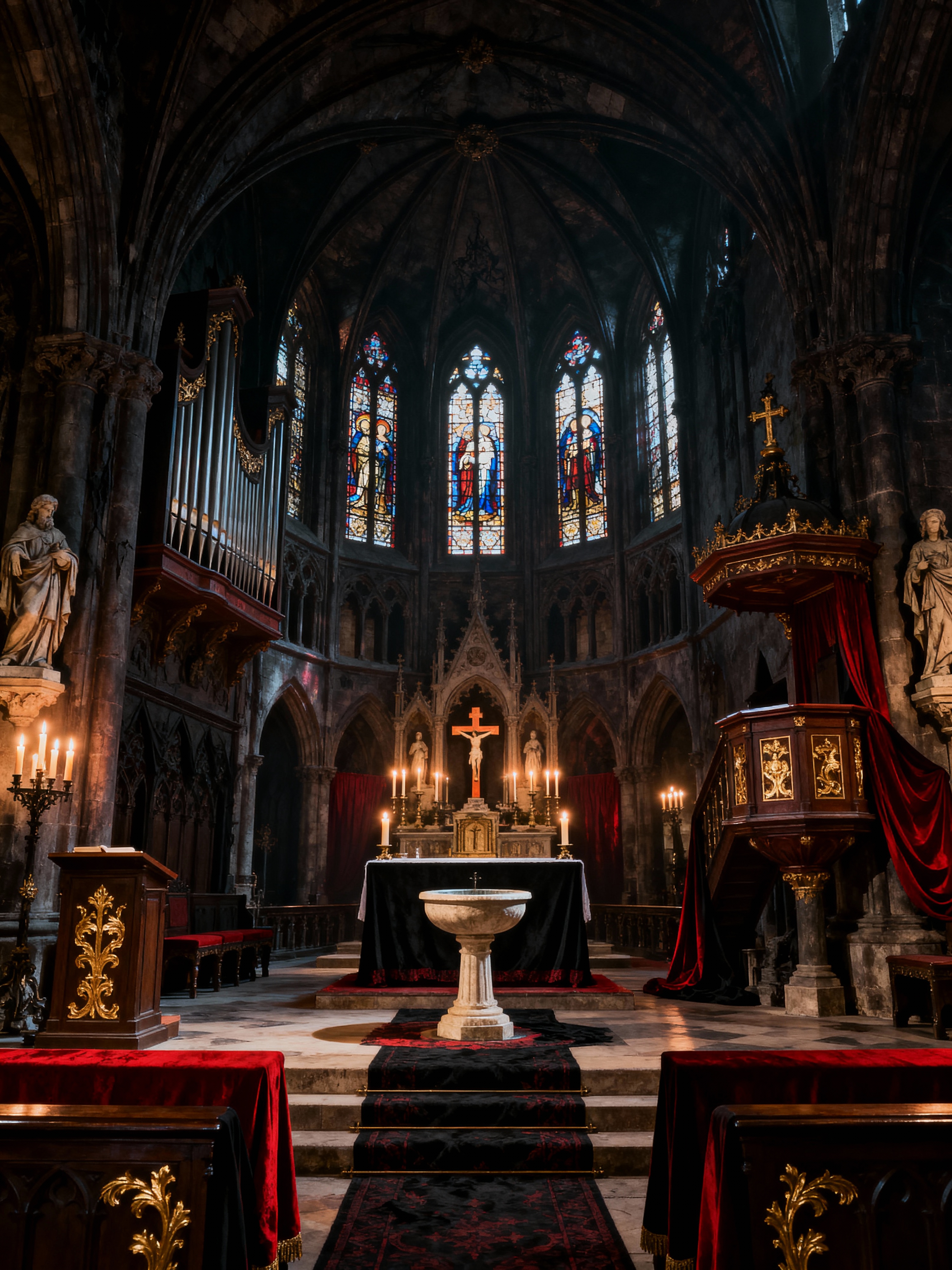 church with gothic style with altar and pulpit and religious statues and organ and cross and baptismal font and stained glass windows and candles. . with rich fabrics and dark colors and cathedral style and mysterious mood and arched windows and dramatic atmosphere and heavy furniture and ornate details