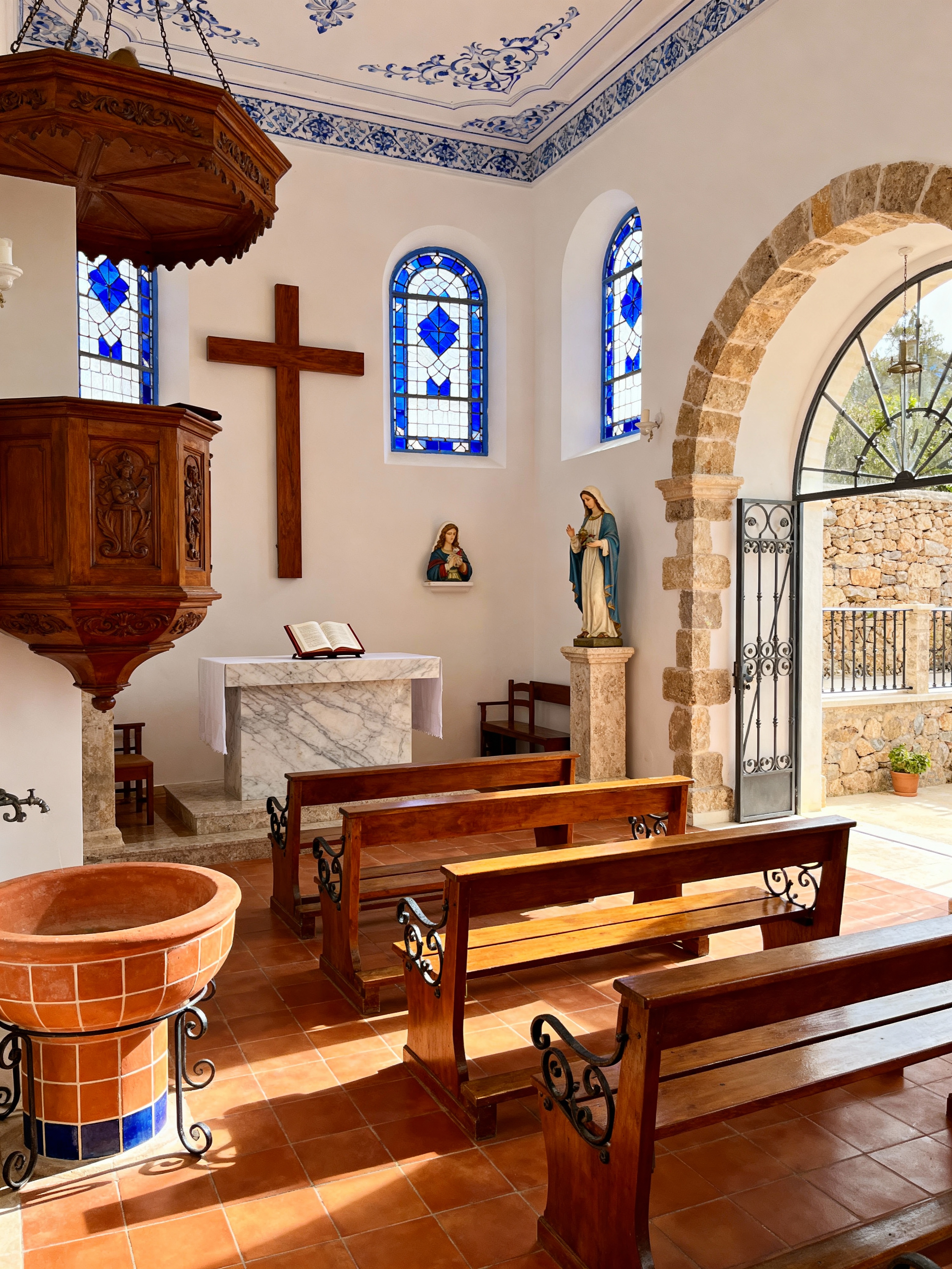 church with mediterranean style with pulpit and altar and cross and hymn books and stained glass windows and pews and religious statues and baptismal font. . with outdoor living and stone accents and wrought iron and sun-drenched and terracotta tiles and warm earth tones and arched doorways and blue and white