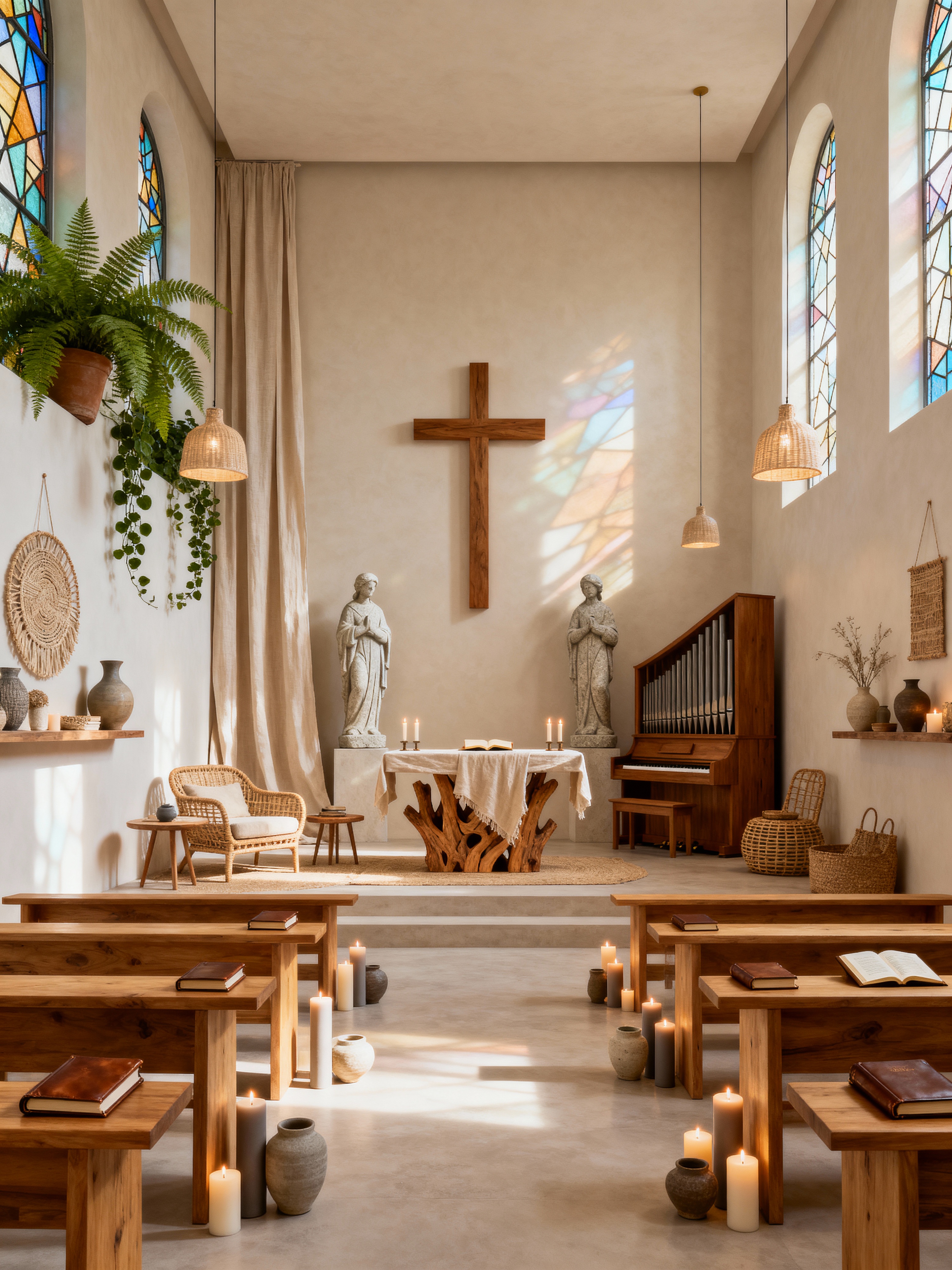 church with modern boho style with religious statues and cross and stained glass windows and altar and organ and hymn books and candles and pews. . with greenery and rattan furniture and handcrafted items and wood decor and natural materials and airy space and linen fabric and minimalist