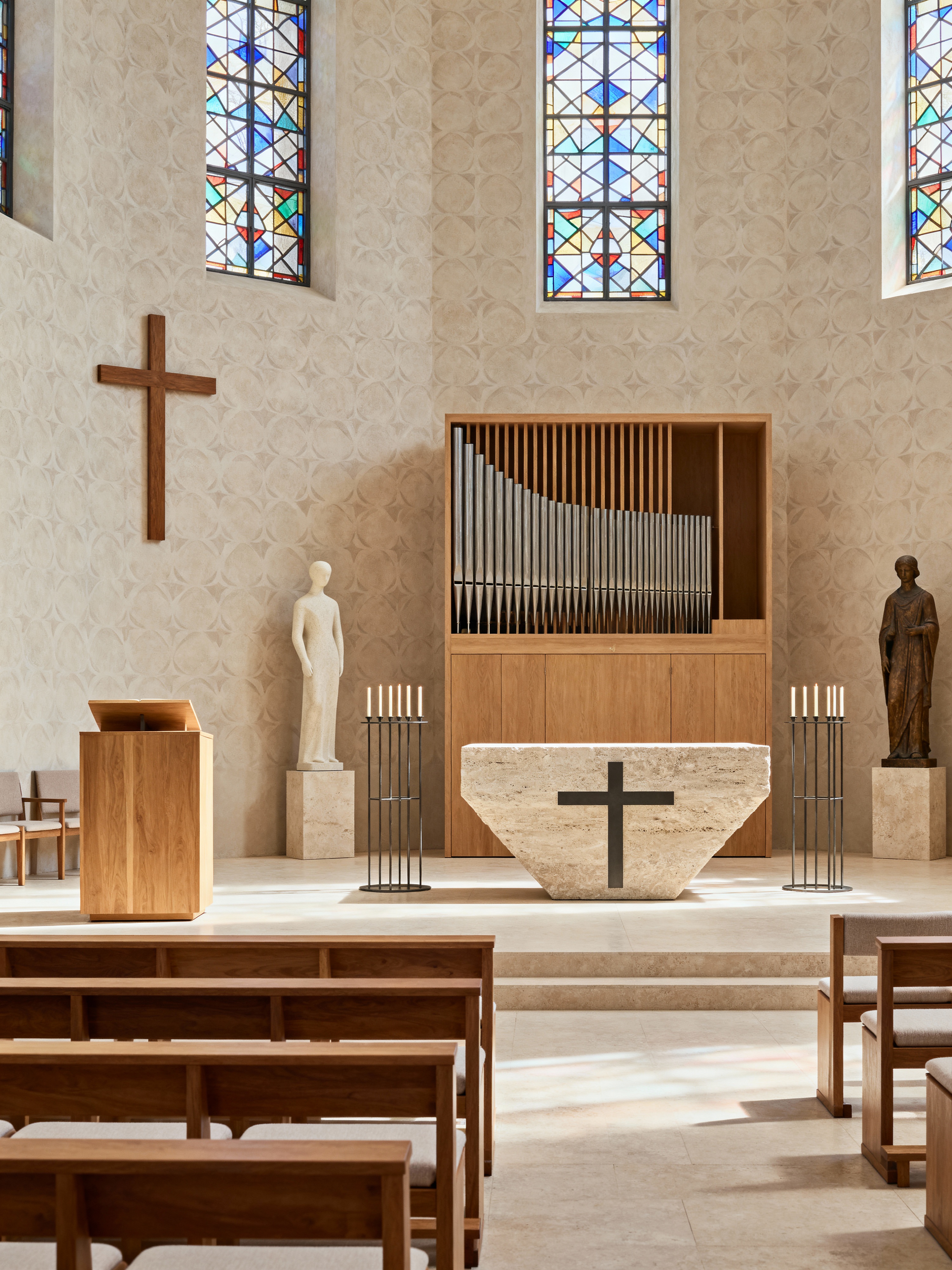 church with modern style with stained glass windows and pulpit and altar and cross and organ and candles and pews and religious statues. . with open and natural lighting and practicality and functionality and natural materials and elements and neutral walls and textures and simple, clean lines and simplistic furniture and open and natural lighting