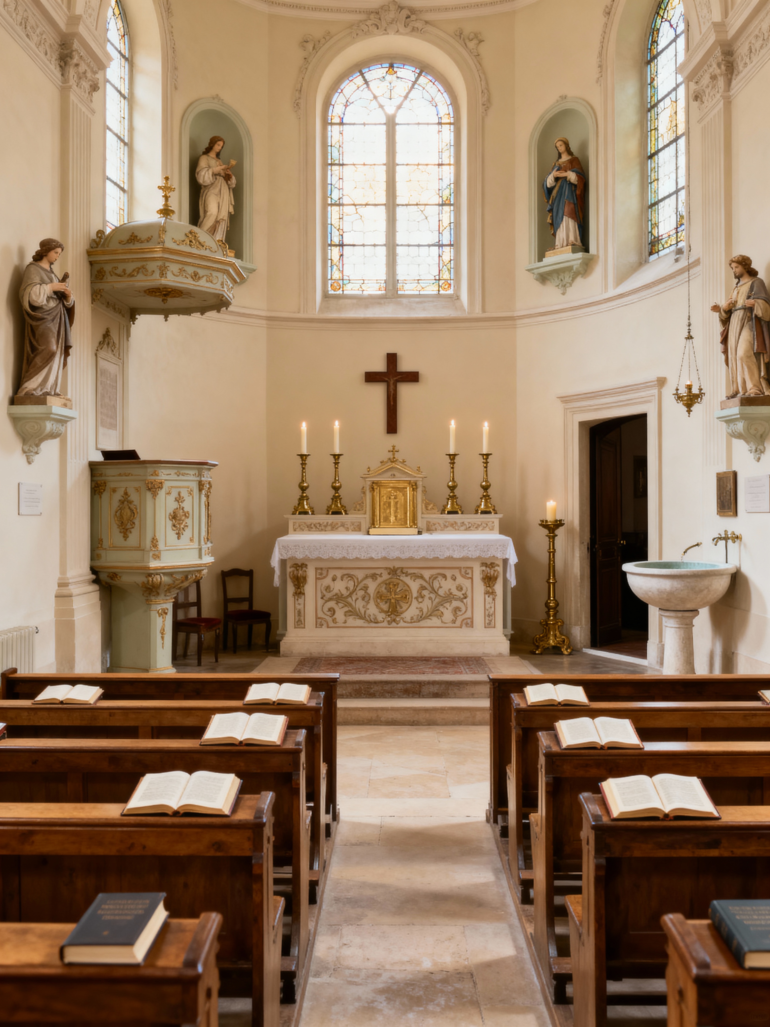 church with parisian style with altar and hymn books and pews and cross and baptismal font and stained glass windows and religious statues and candles. . with european flair and french elegance and vintage pieces and sophisticated charm and chic simplicity and ornate moldings and neutral palette and antique furniture
