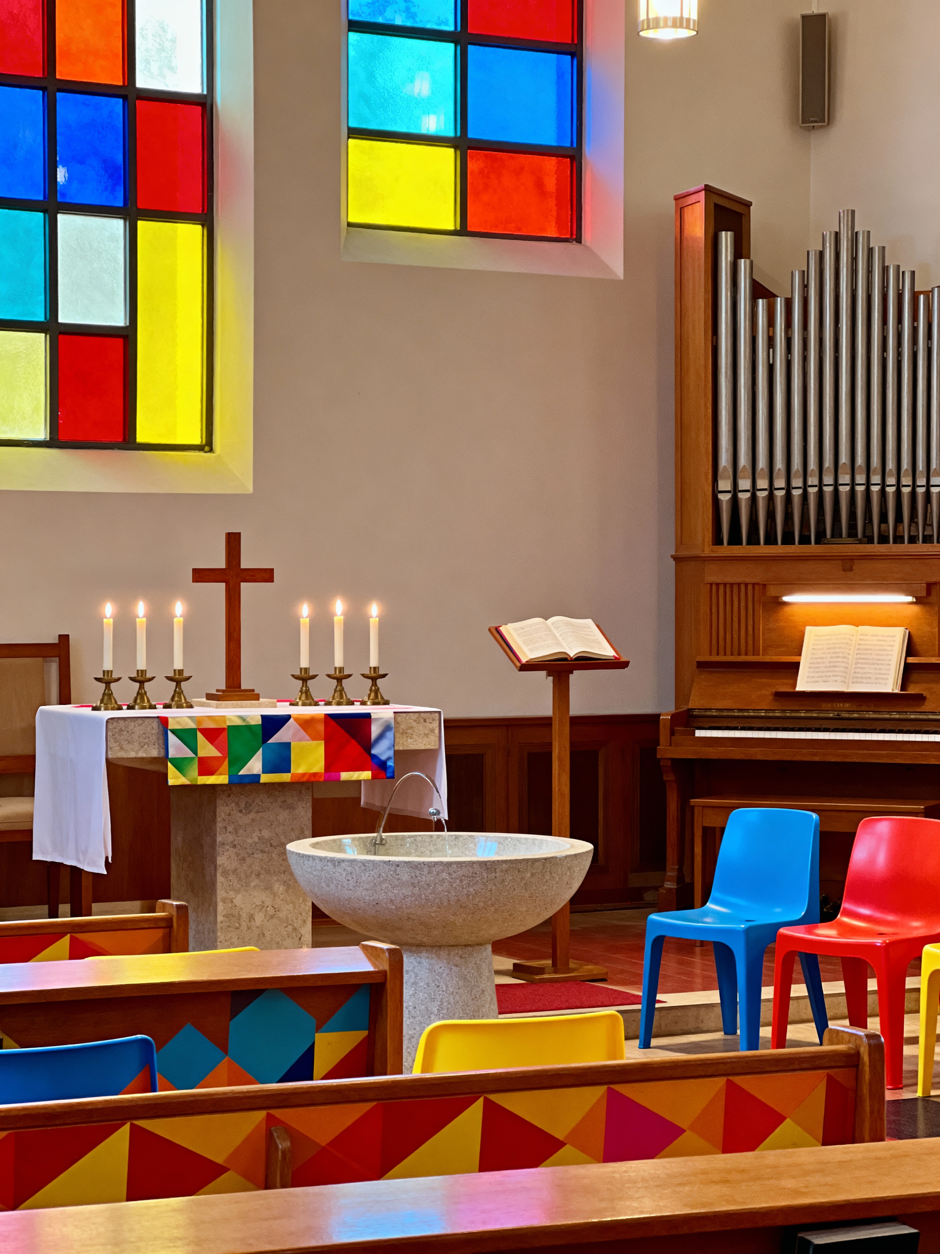church with retro style with candles and baptismal font and cross and hymn books and organ and altar and pews and stained glass windows. . with groovy vibes and mod style and nostalgic pieces and bright colors and vintage revival and plastic furniture and geometric shapes and funky decor