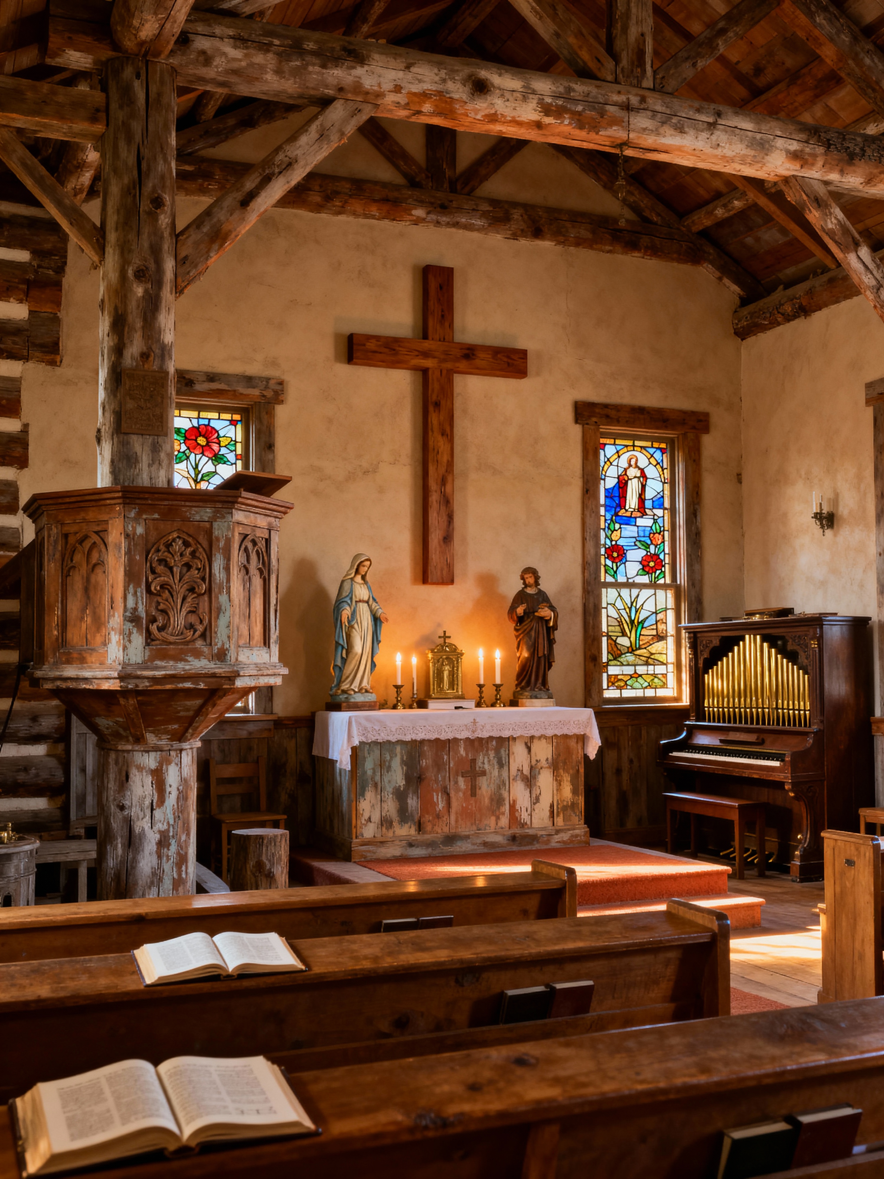 church with rustic style with cross and stained glass windows and pulpit and altar and religious statues and candles and organ and hymn books. . with distressed finishes and cozy cabin and vintage decor and country style and warmth and earthy tones and exposed beams and natural wood