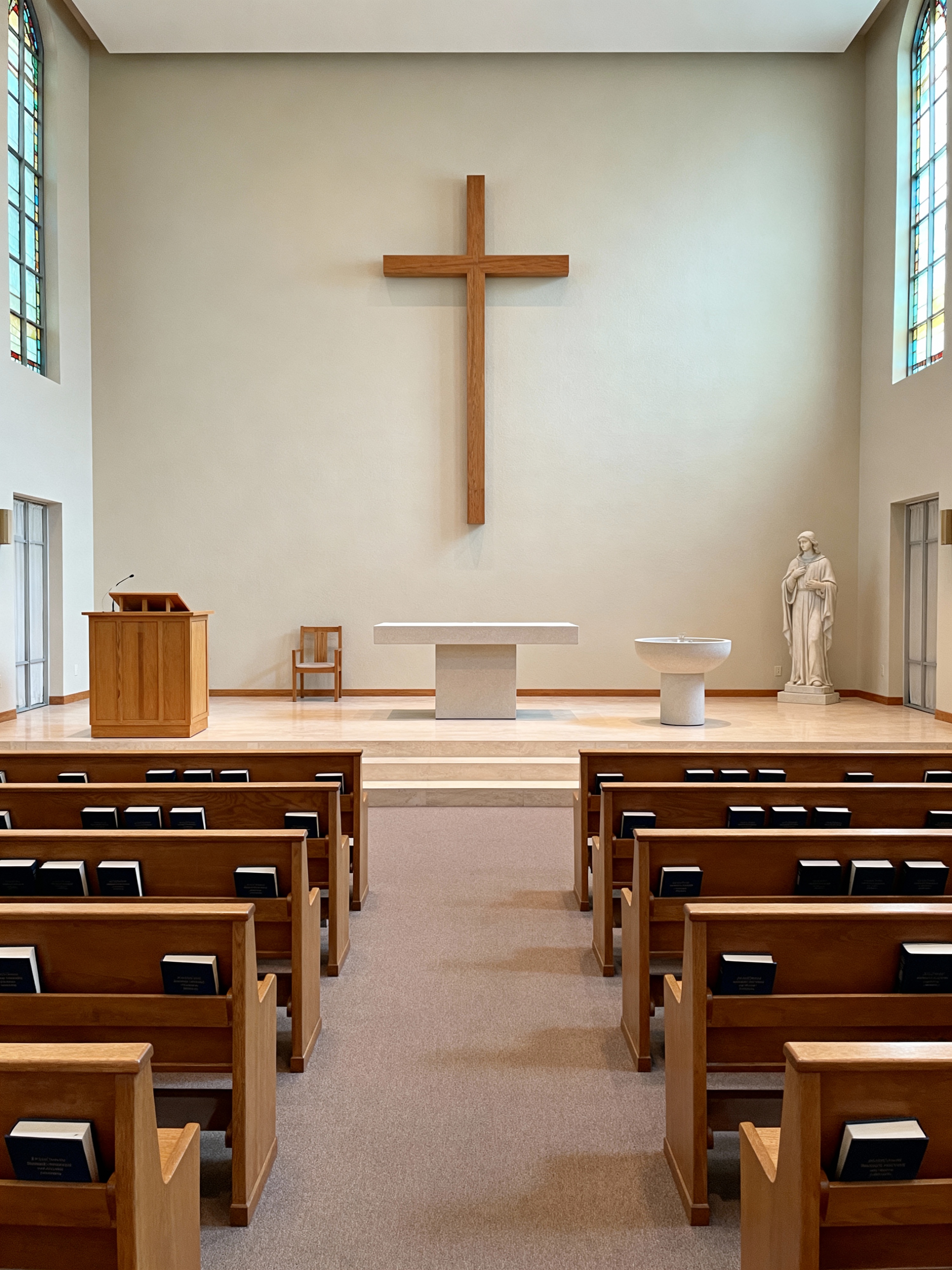 church with simple style with hymn books and pulpit and cross and pews and altar and baptismal font and stained glass windows and religious statues. . with essential pieces and clean design and streamlined look and neutral colors and calm atmosphere and understated style and basic elements and functional furniture