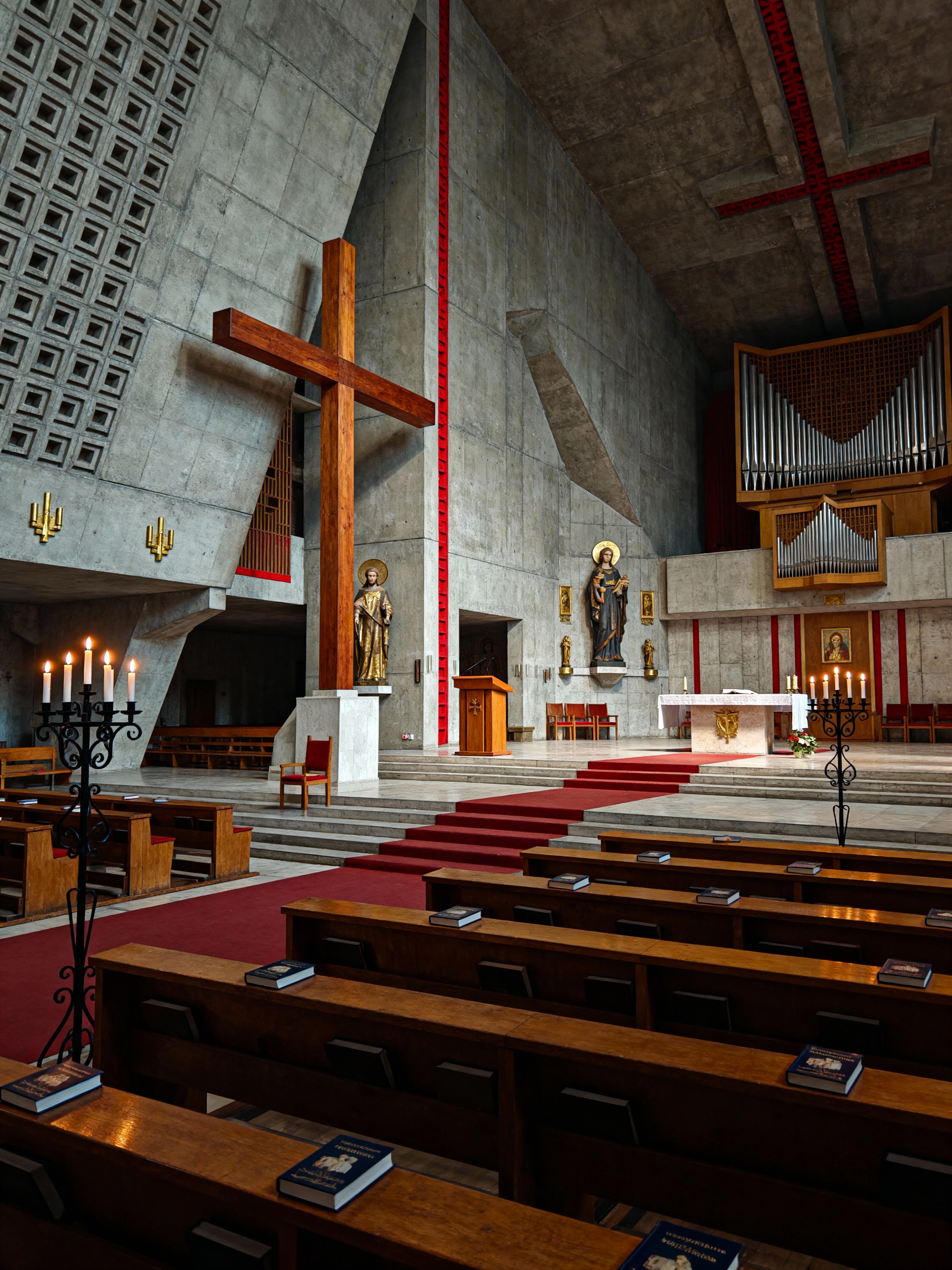 church with soviet style with pews and cross and candles and pulpit and altar and religious statues and organ and hymn books. . with utilitarian design and communist design and concrete structures and monumental scale and functional furniture and austere aesthetic and soviet-era architecture and socialist realism