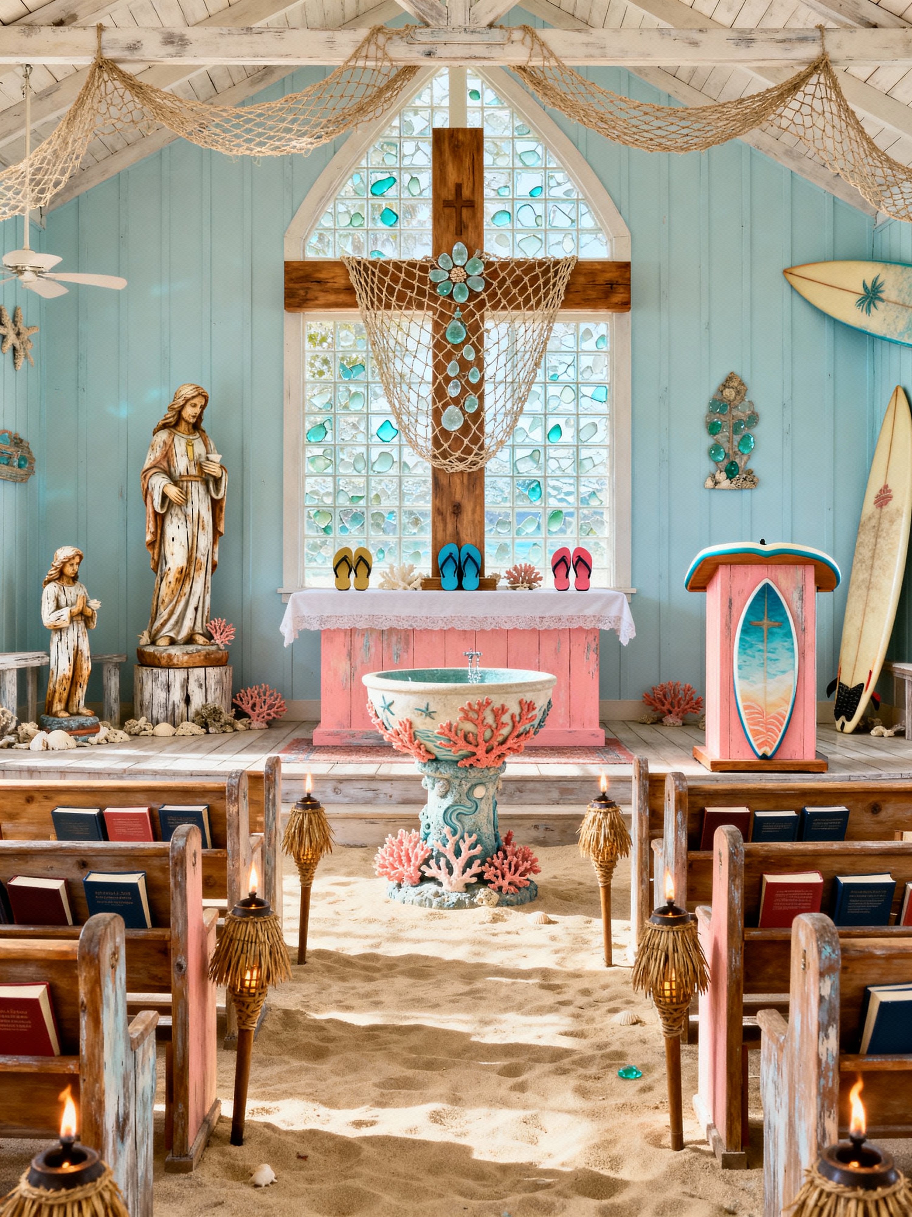 church with surf shack style with hymn books and religious statues and cross and baptismal font and pulpit and pews and candles and altar. . with flip-flops and tiki torches and net decorations and ocean-inspired colors and sun-bleached wood and coral accents and sea glass and surfboard decor
