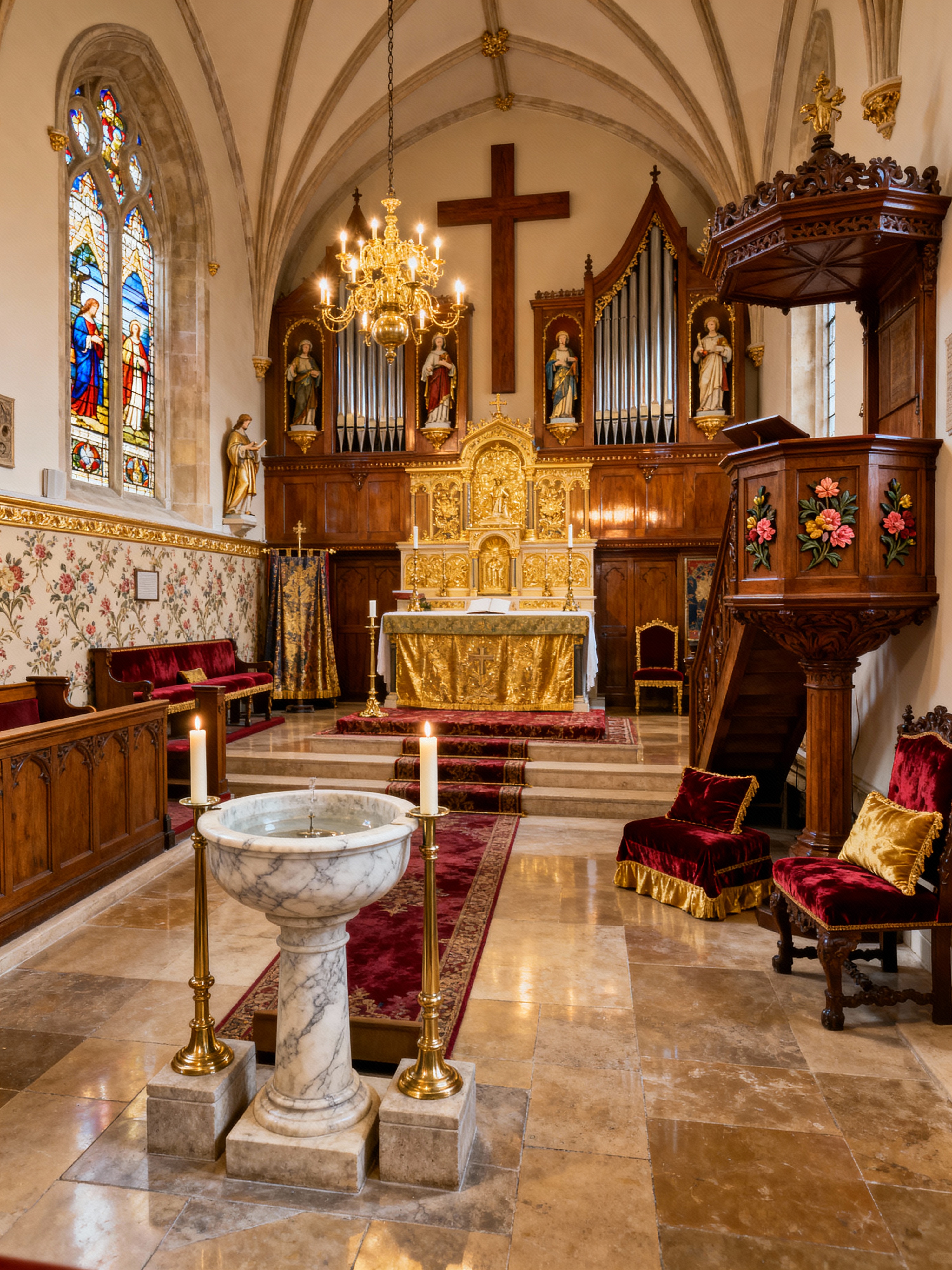 church with traditional style with baptismal font and candles and pulpit and altar and religious statues and cross and stained glass windows and organ. . with refined atmosphere and classic elegance and symmetrical layout and formal furniture and rich fabrics and antique pieces and ornate details and luxurious textiles