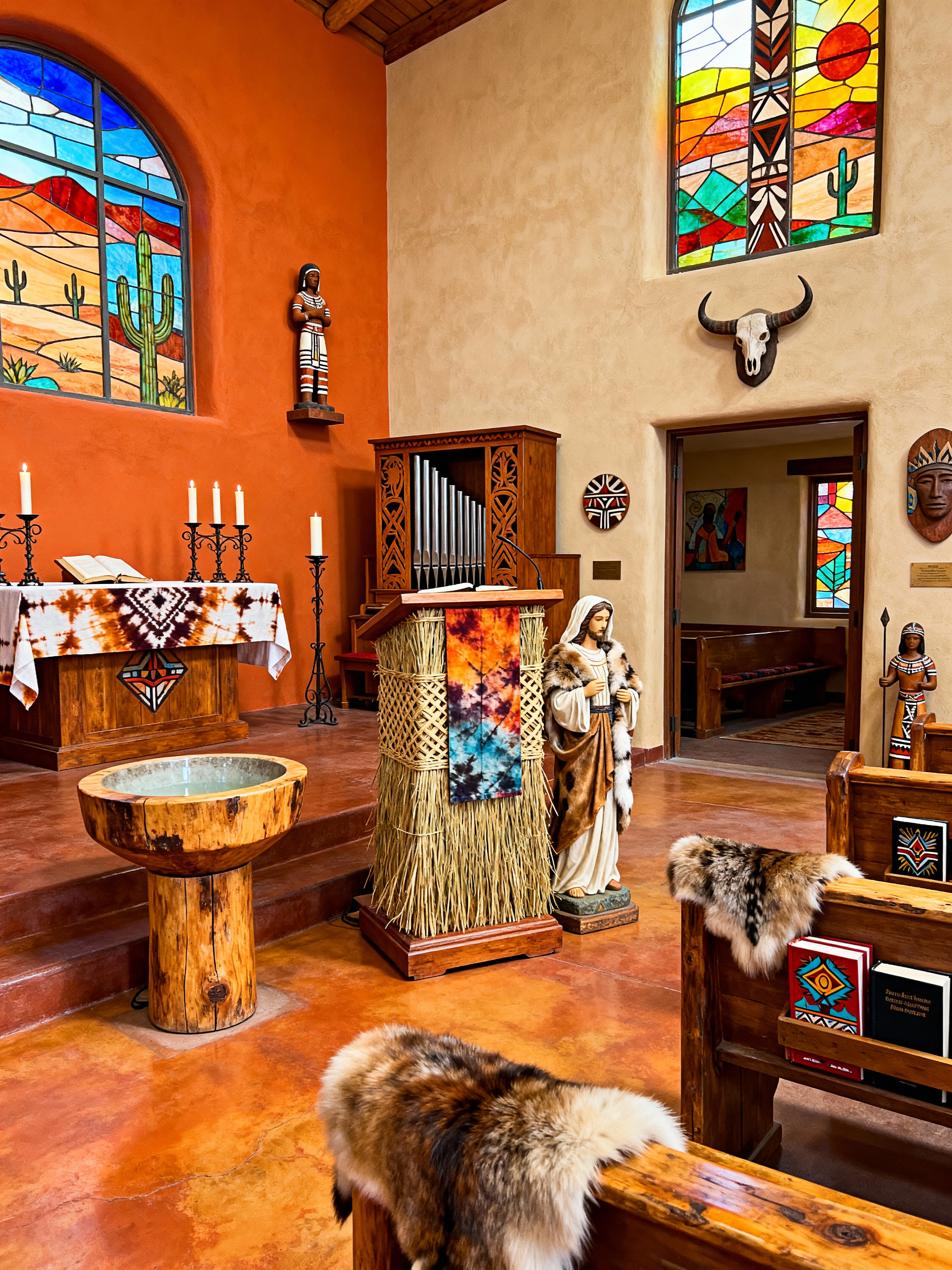 church with tribal style with pulpit and religious statues and candles and baptismal font and organ and hymn books and stained glass windows and altar. . with animal furslinen and intricate grass weaving and hand dyed batik fabrics and tribal revival and smooth worn timbers and exuberant splashes of colour and sculptures and artworks and desert colours