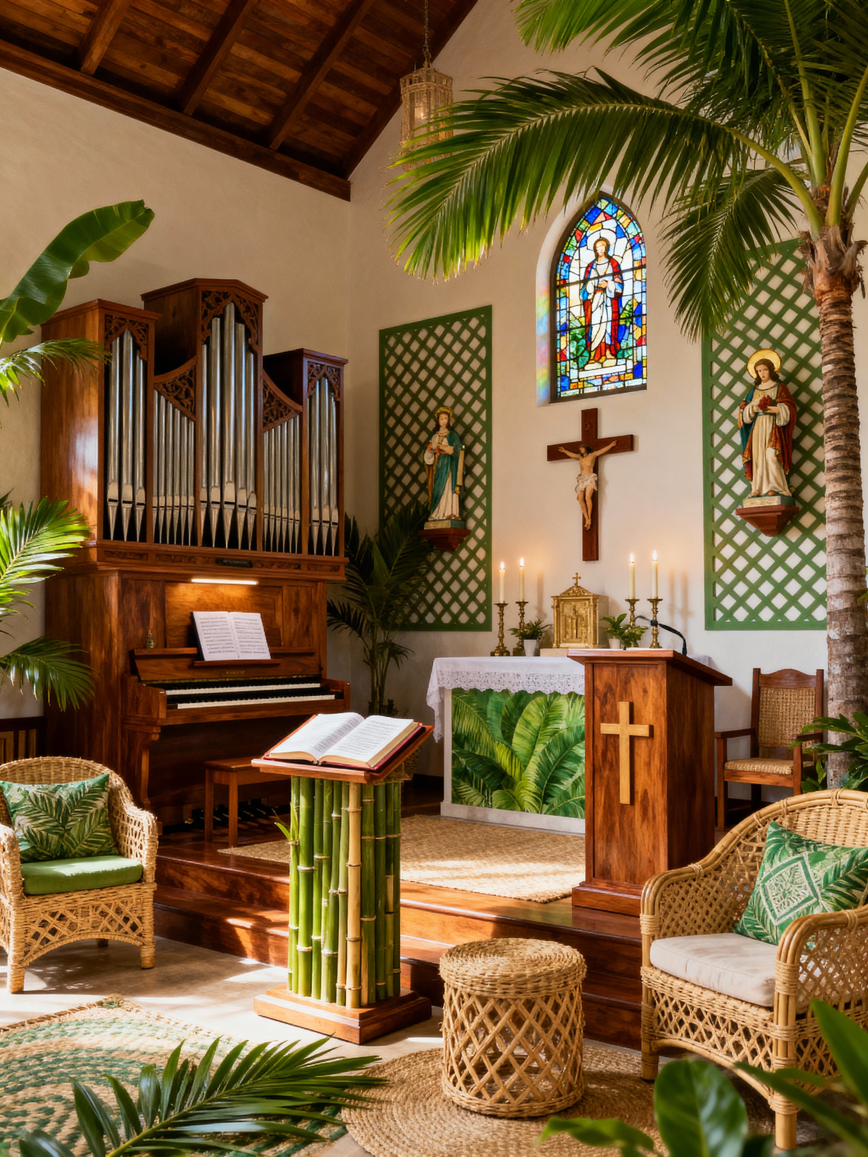 church with tropical style with organ and altar and cross and religious statues and stained glass windows and pulpit and candles and hymn books. . with lattice prints and palm leaves and palm trees and cane motifs and bamboo and wicker and rattan and teak